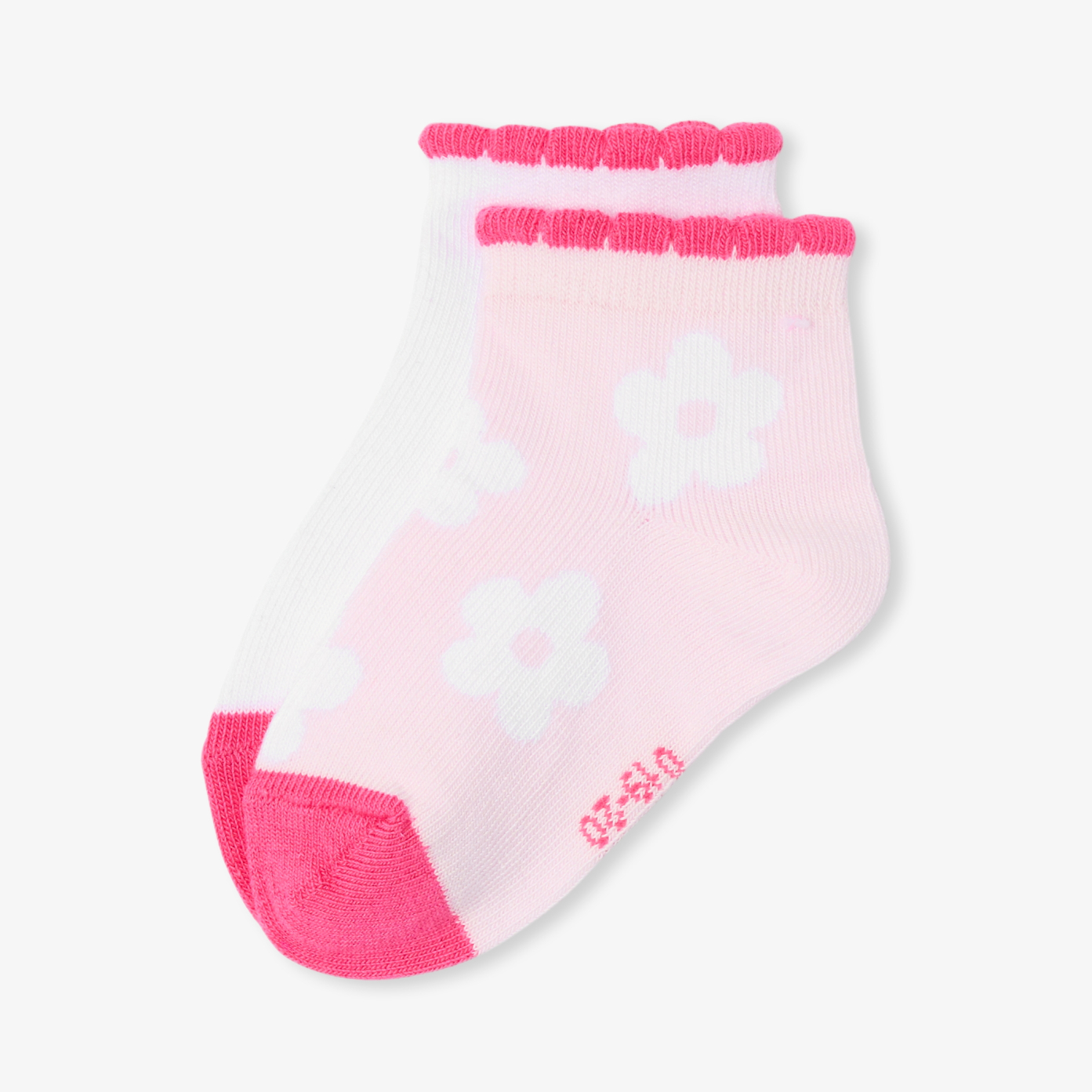 Finish off your daughter's outfits with originality by choosing this duo of socks. Low-cut and animated with intarsia flowers, you will be able to pair them with matching garments for a chic, geometric silhouette.-Soft-knit baby girl socks-Short, scalloped top-Placed intarsia flower and all-over flowers