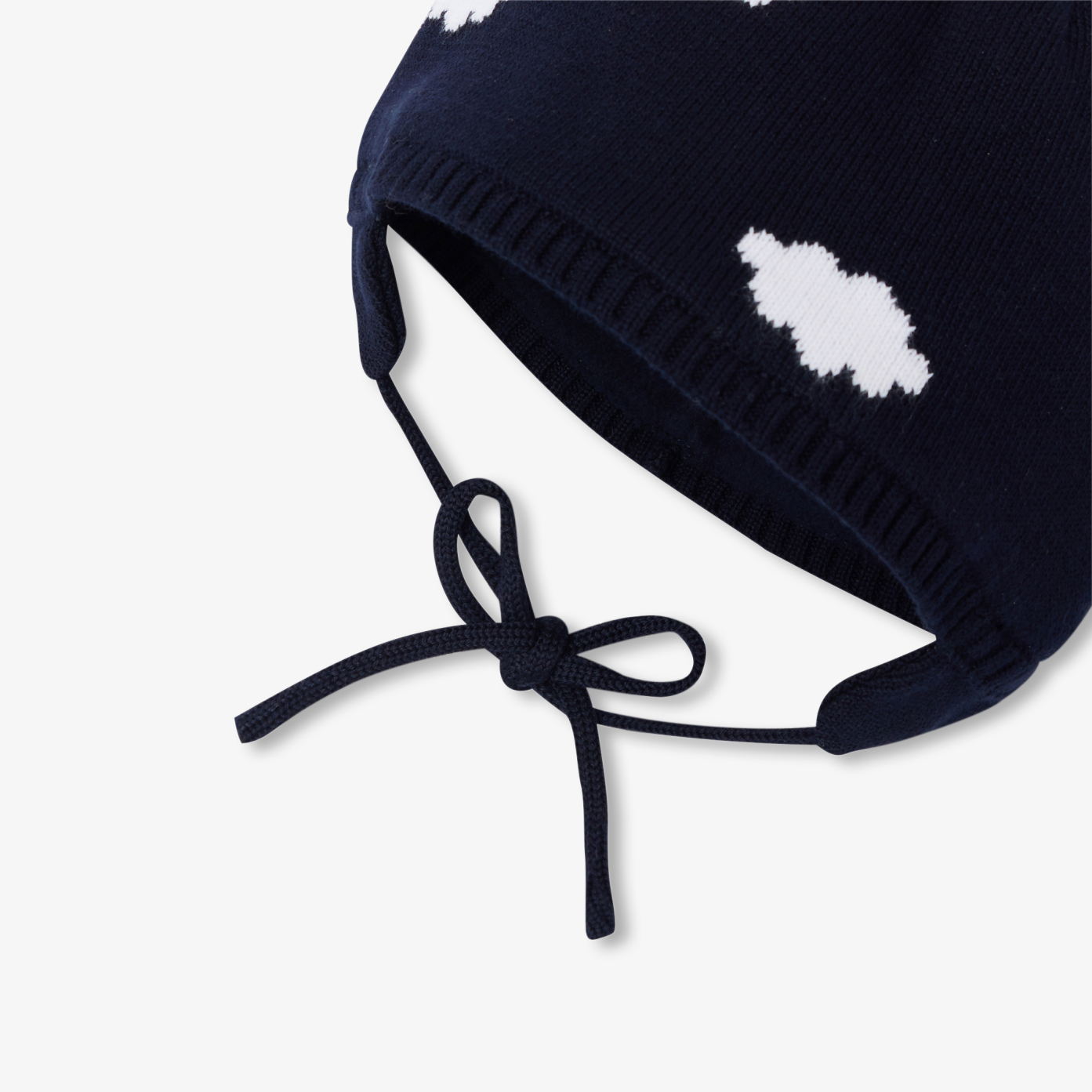 Geometric and full of tenderness, this baby bonnet transports baby into a charming universe with its cloud motif. Soft and warm thanks to its microfleece lining, this chapka-style model with its earflaps will protect baby when you're out and about.- Knitted baby hat- Microfleece lining- Decorative pompom- Ties to tie- Covering design