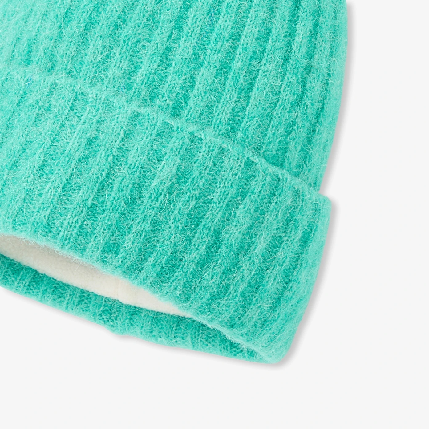 Available in a new yarn composed of wool and alpaca for a fluffy, frothy effect, this girl beanie seduces with its soft green colour. In ribbed knit, with a cuff and microfleece lining for optimum comfort, complete this minimalist model with a snood and gloves.- Girl wool and alpaca beanie- New fluffy yarn- Ribbed knit- Cuff- Microfleece lining
