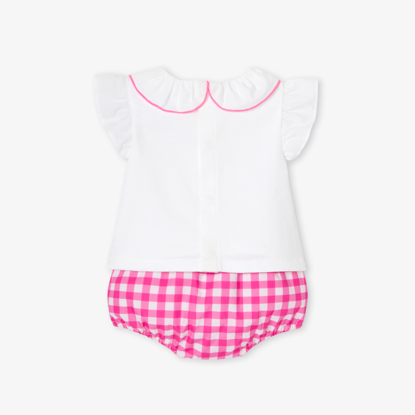 Compose your little one's first summer wardrobe with the elegant modernity of this baby girl set. Combining a jersey t-shirt with ruffled collar and sleeves and a poplin bloomer printed in a delightful gingham and accessorised with a ruffled yoke, this fresh duo will accompany everyday wear with softness and originality.-Cotton baby girl set-Ruffled collar with contrasting bourdon stitch-Ruffled sleeves-Press stud opening at back-Ruffled lined bloomer-Elasticated waistband