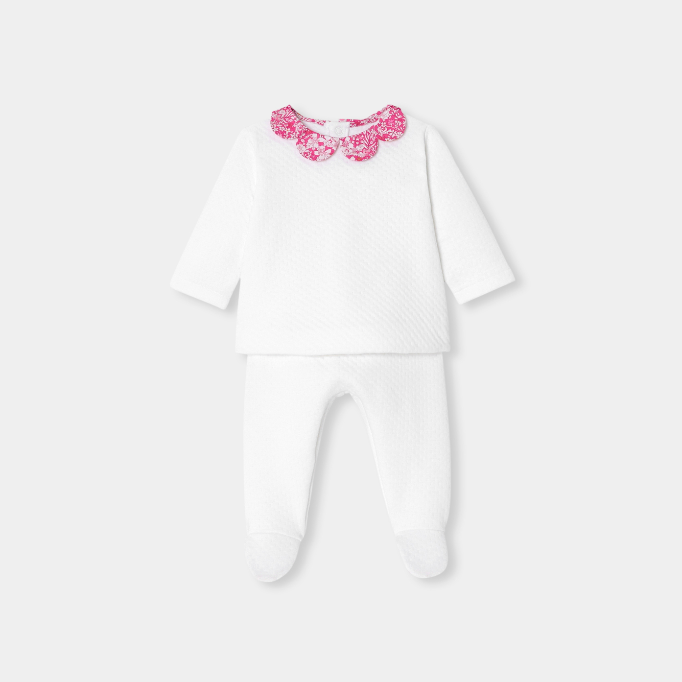 Create a chic, versatile wardrobe with this baby girl set. Made from ultra-comfortable double sided cotton jersey, it features a snap-back top and trousers with elasticated waistband for easy dressing. Ideal for everyday wear, its comfort fit is enhanced by a petal collar and Liberty fabric underfoot.- Organic cotton double sided jersey baby girl comfort set- Back press stud top- Elastic waistband trousers- Petal collar and Liberty fabric underfoot in June's Meadow colouring