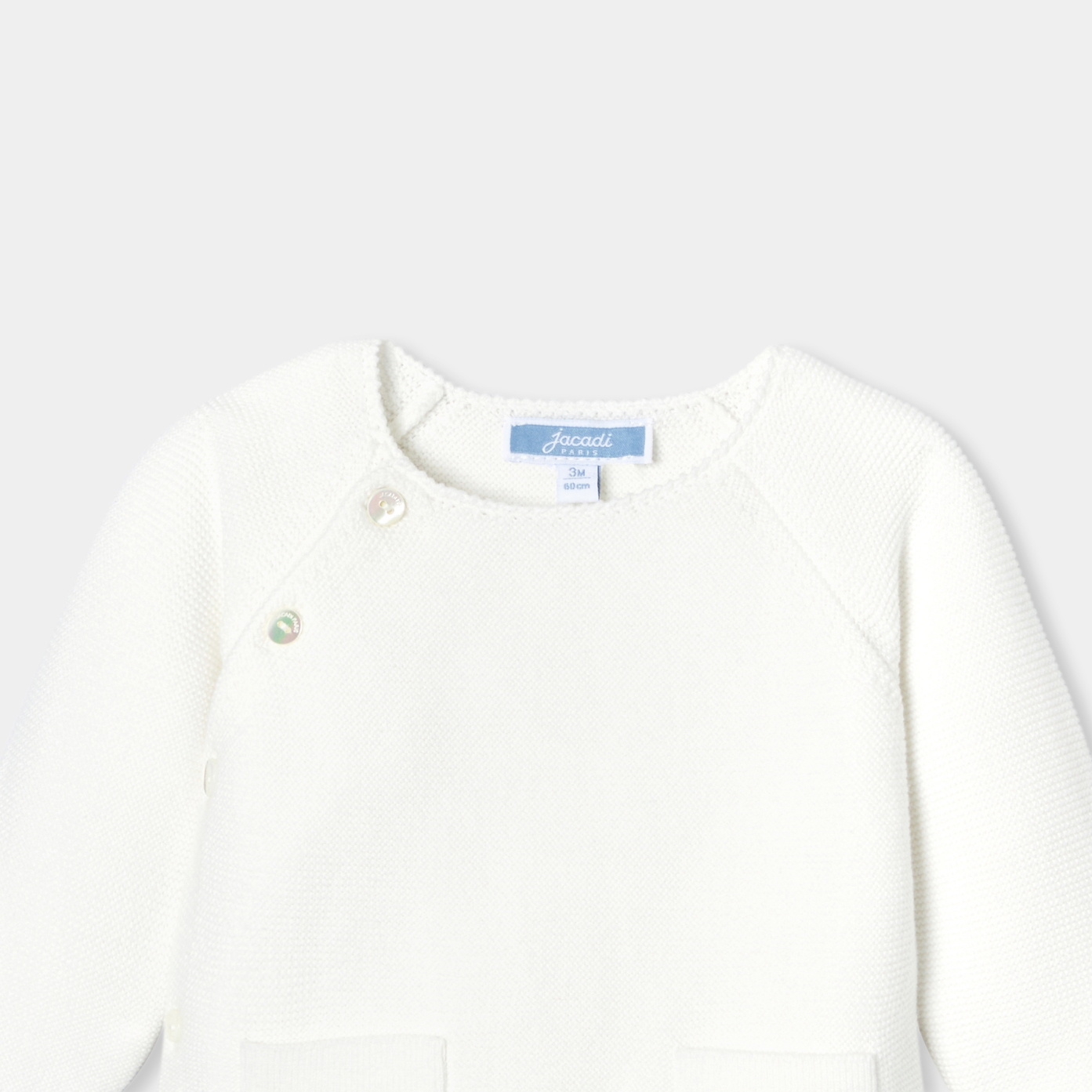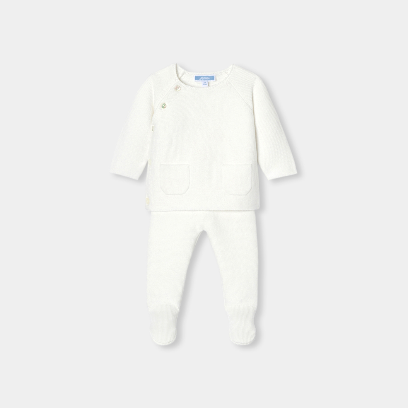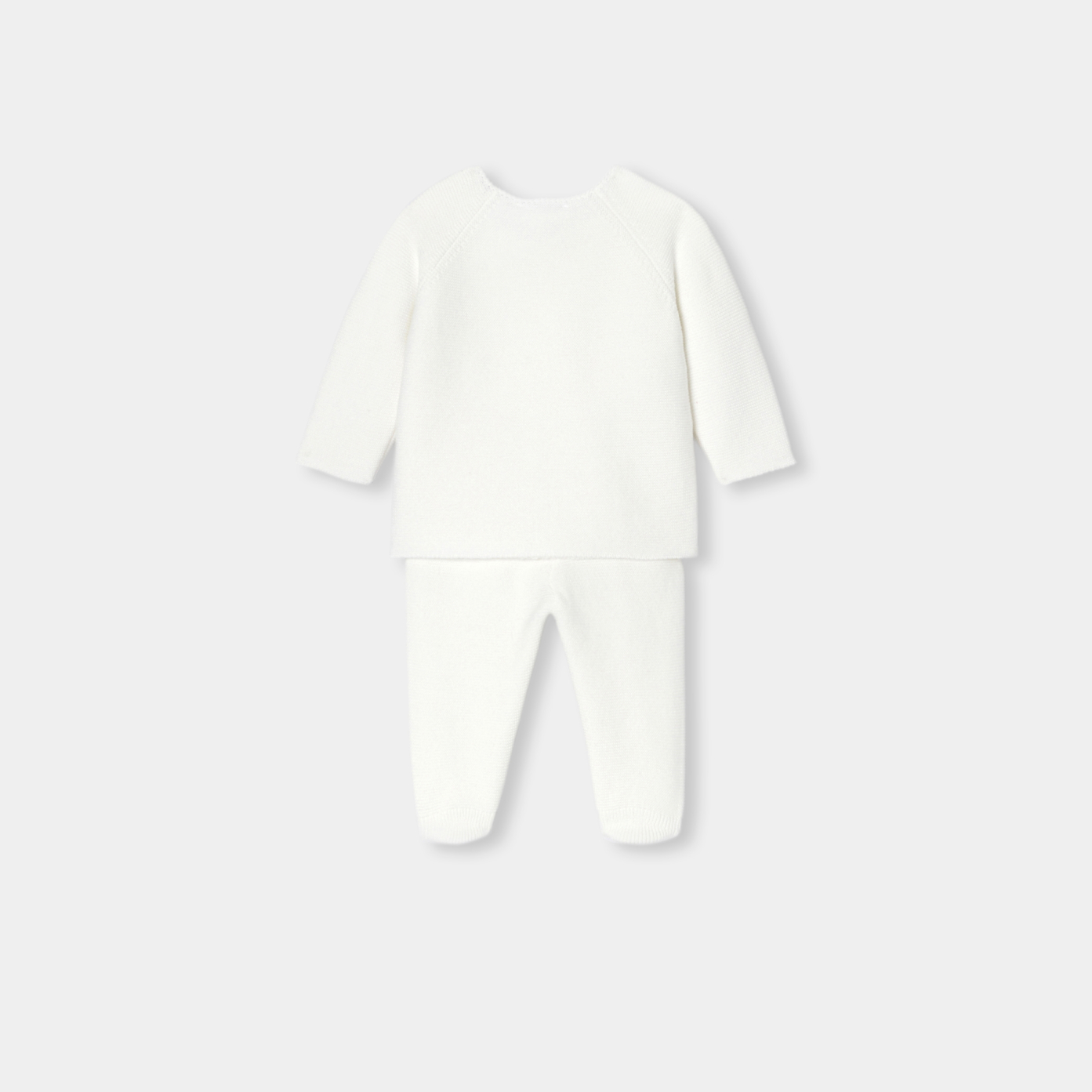 A must-have for any newborn wardrobe, this garter-stitch baby set combines the softness of organic cotton with the timeless elegance of garter-stitch knitwear. It comprises a top with natural mother-of-pearl button front and patch pockets, and footed trousers with high elasticated waistband to cover the tummy. A perfect signature outfit to accompany baby's first days, a precious birth gift to be passed down among siblings.-Baby birth set- Organic cotton - Garter-stitch knit - Top with natural mother-of-pearl buttons on front - Patch pockets on front - Footed trousers - High elastic waistband