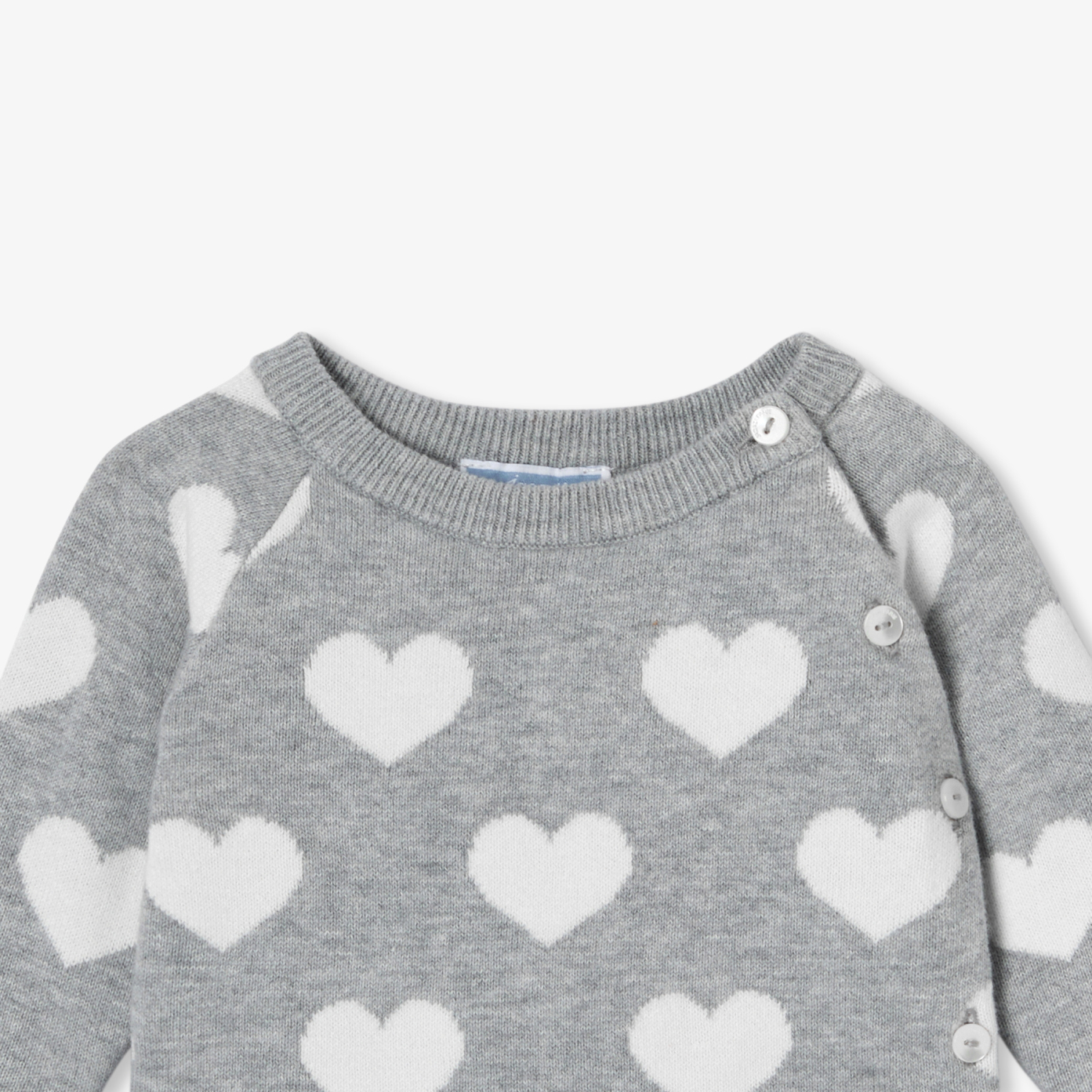 The softness of jersey cotton, the tenderness of a heart motif, this baby girl set is the perfect everyday outfit. Easy to live with and easy to put on thanks to its front opening and elasticated waistband trousers, this duo is ready to be worn from the very first weeks.- Organic cotton baby set- Soft, covering double-sided jersey knit- Button-opening top in natural mother-of-pearl- Footed trousers with elasticated waistband