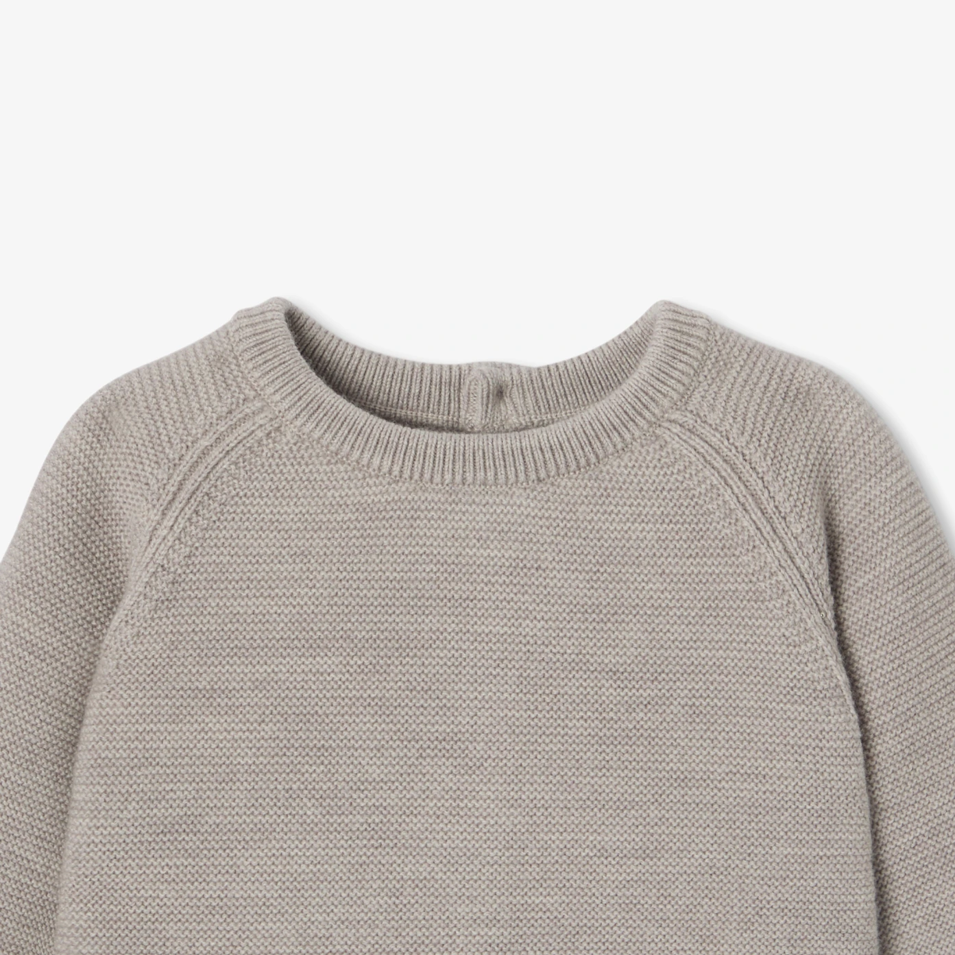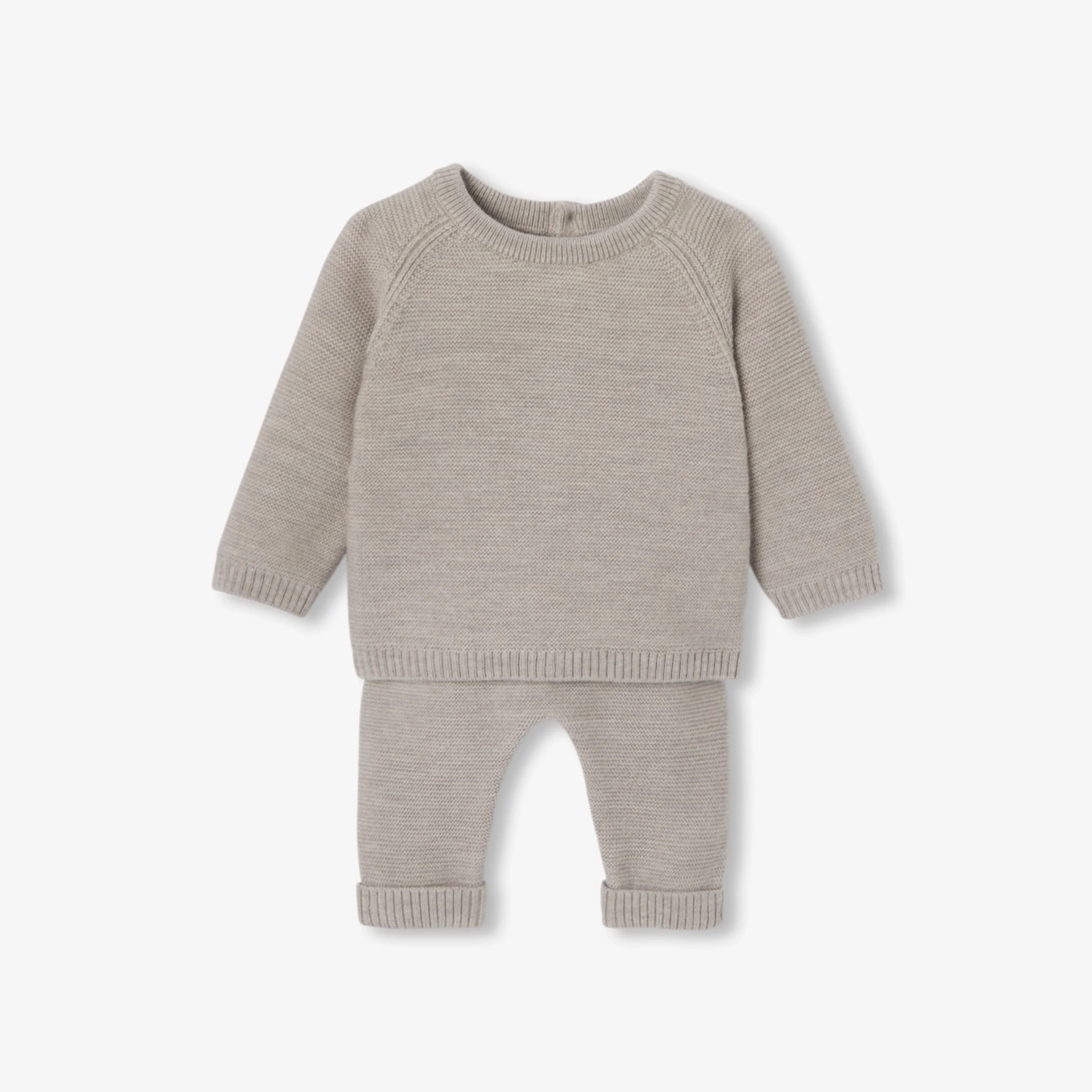 This baby set is an invitation to comfort. Composed of a sweater opening at the back with natural mother-of-pearl buttons and trousers with elasticated waistband. Its warm, cosy garter-stitch knit and relaxed, chic cut make it a winter essential for everyday wear. - Knit baby set- Opening at back with natural mother-of-pearl buttons- Trousers with elasticated waist- Great birth gift idea to give or to treat yourself.-Unisex item suitable for both girls and boys.