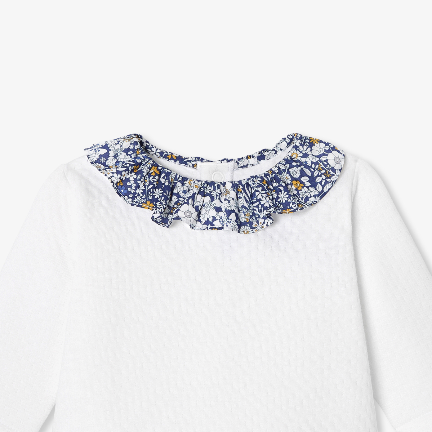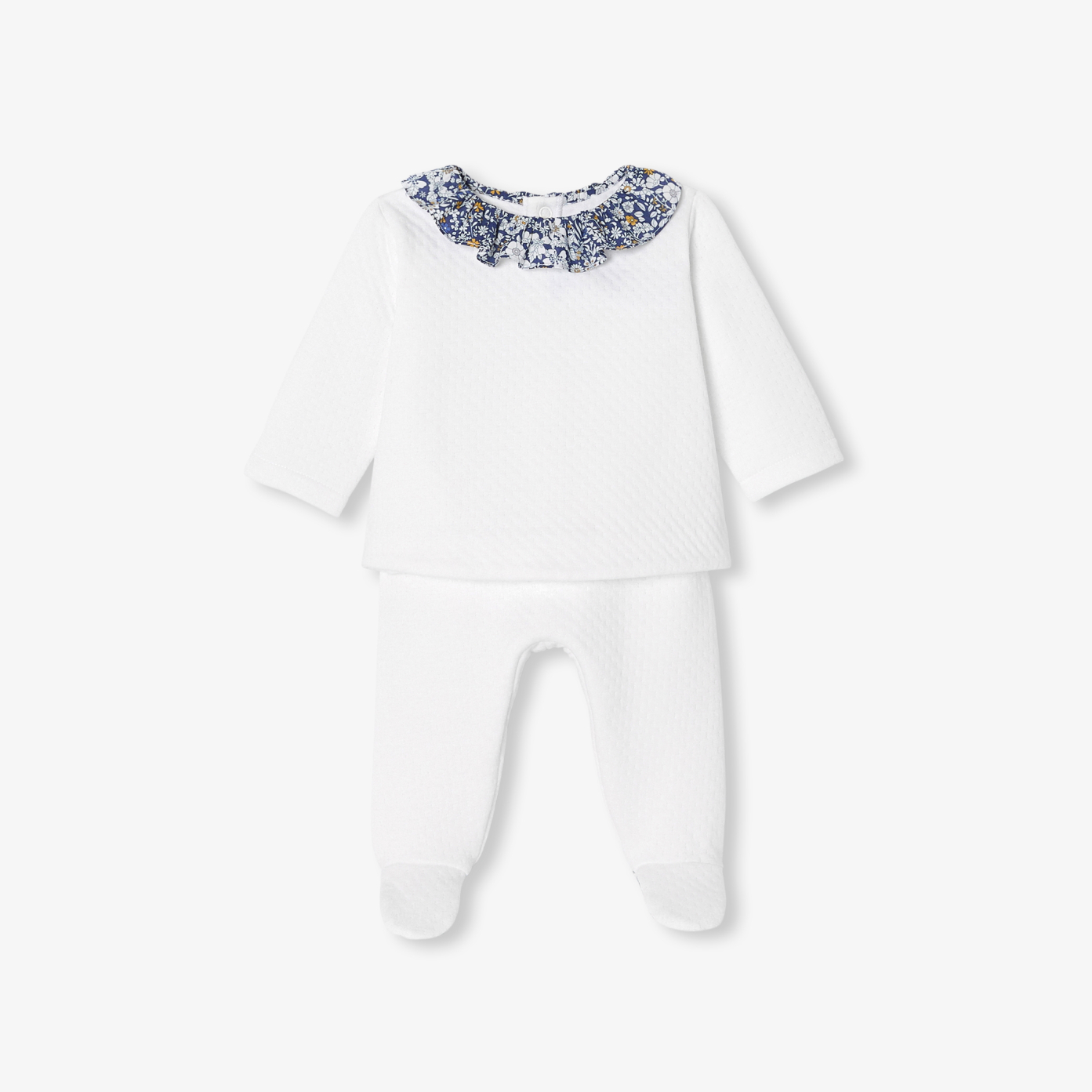 A season punctuated by a smart casual wardrobe with this baby girl set. Made in soft, supple organic cotton double sided jersey, an elegant Liberty fabric ruffle and underfeet sublimate this comfortable duo perfect for daycare and everyday wear.- Baby comfort set in double sided organic cotton jersey- Back snap opening- Trousers with elasticated waistband- Collar and under feet in Liberty June's Meadow fabric, exclusive Jacadi colouringPretty idea for a birth gift to offer or to treat yourself.