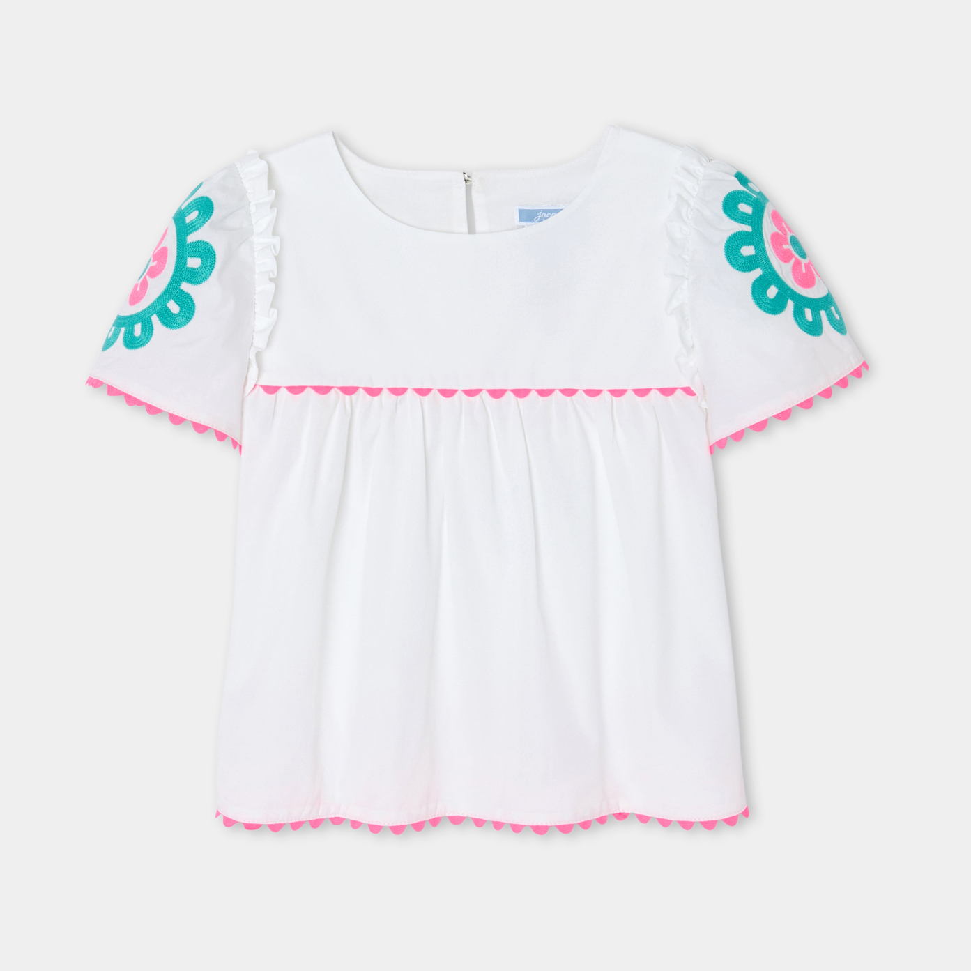 A must-have piece for the spring wardrobe, this timeless white blouse will transport your little girl's looks into a colourful folk universe. Flounced at the shoulders, embroidered with rosettes and highlighted with fuchsia croquet ribbons, you'll love it for all its fashionable details.- Girl blouse in poplin- Sleeves embroidered with rosettes- Flounced at the shoulders- Croquet ribbon trim- Back opening