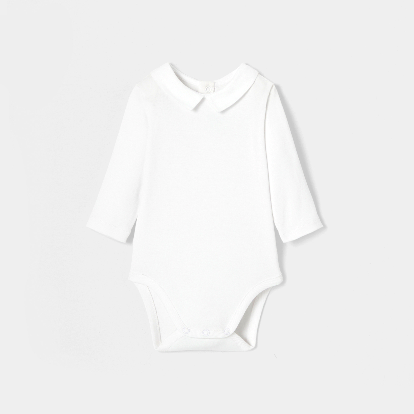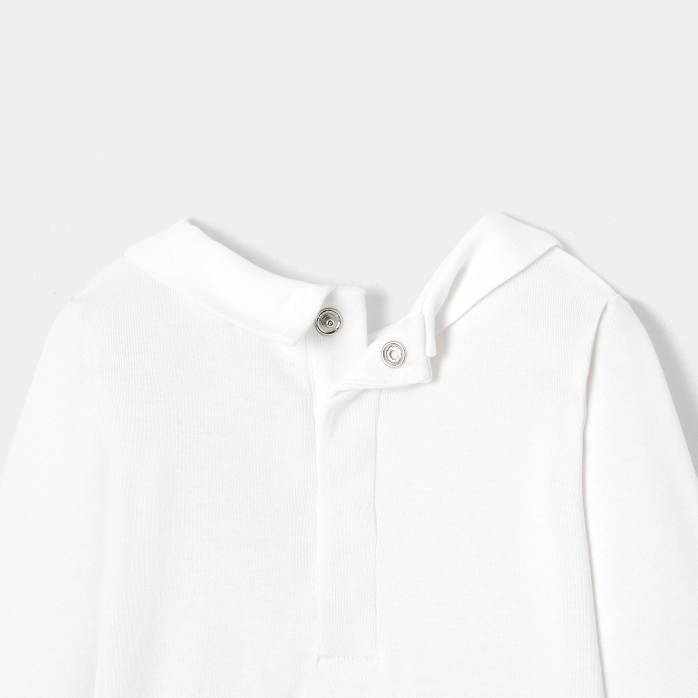 Designed as part of a newborn set, this long-sleeved bodysuit is made from skin-friendly organic cotton. Embellished with a cotton piqué collar, match this classic, pure elegance with a jumpsuit or overalls. - Long-sleeved bodysuit in organic cotton - Cotton piqué collar - Back and crotch snaps