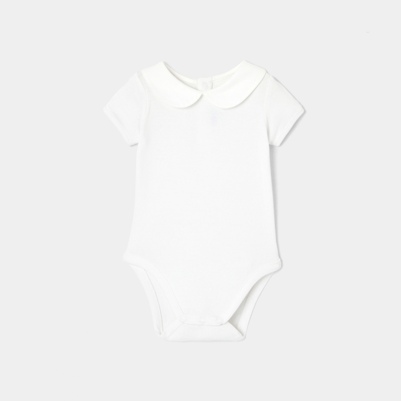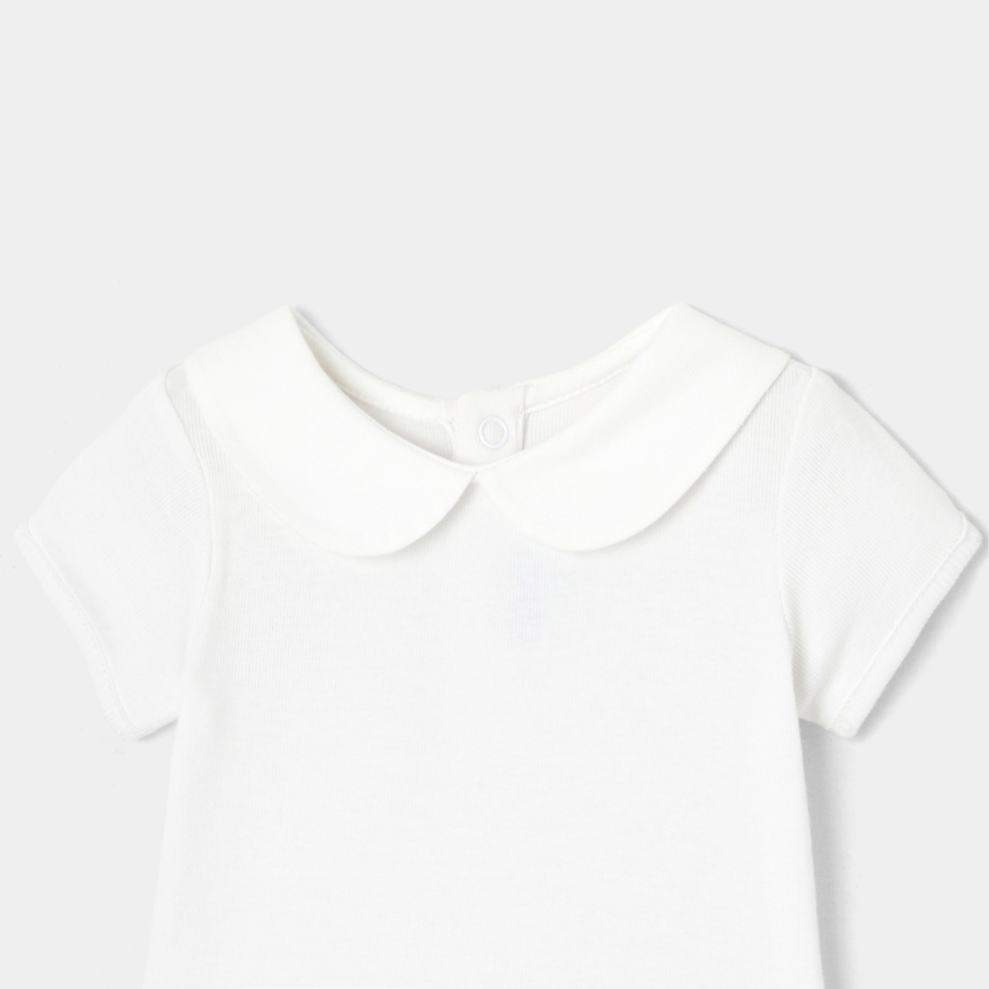 A classic of the summer wardrobe, this baby girl bodysuit is adorned with an elegant Peter Pan collar in cotton piqué for the occasion. Simple and refined, it will slip equally well under a romper or a dress in Liberty Fabrics.- Baby girl bodysuit in organic cotton- Short sleeves- Cotton piqué collar- Press studs at back and crotch
