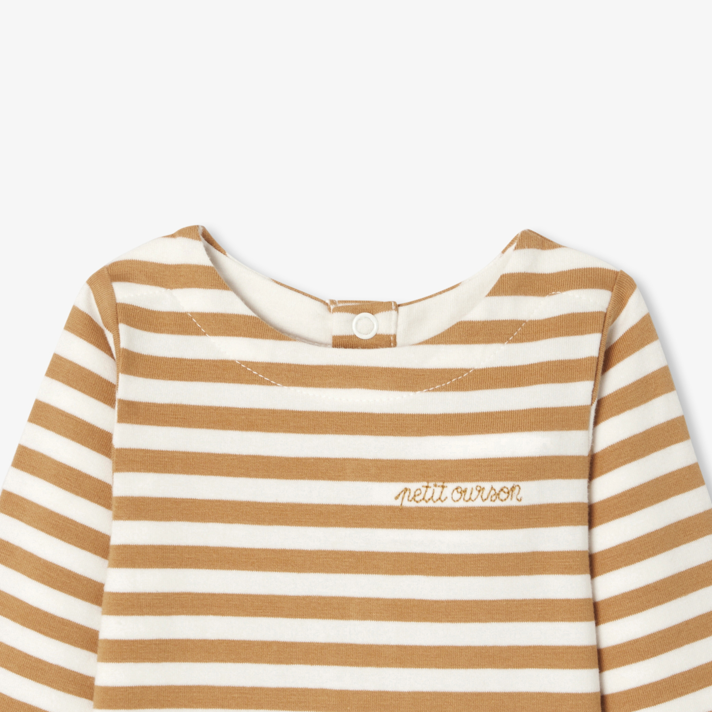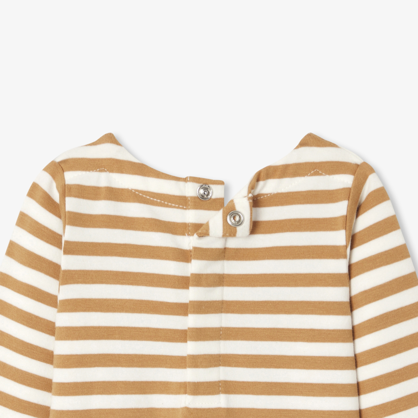 A t-shirt spirit with a round neckline, this baby long-sleeved bodysuit features caramel stripes for the season. Worn with velvet overalls and a cashmere cardigan, this soft, easy-to-slip-on essential opens at the back and crotch with snaps.- Organic cotton baby bodysuit- Round neck- Snaps at back and crotch-Unisex item suitable for both girls and boys.