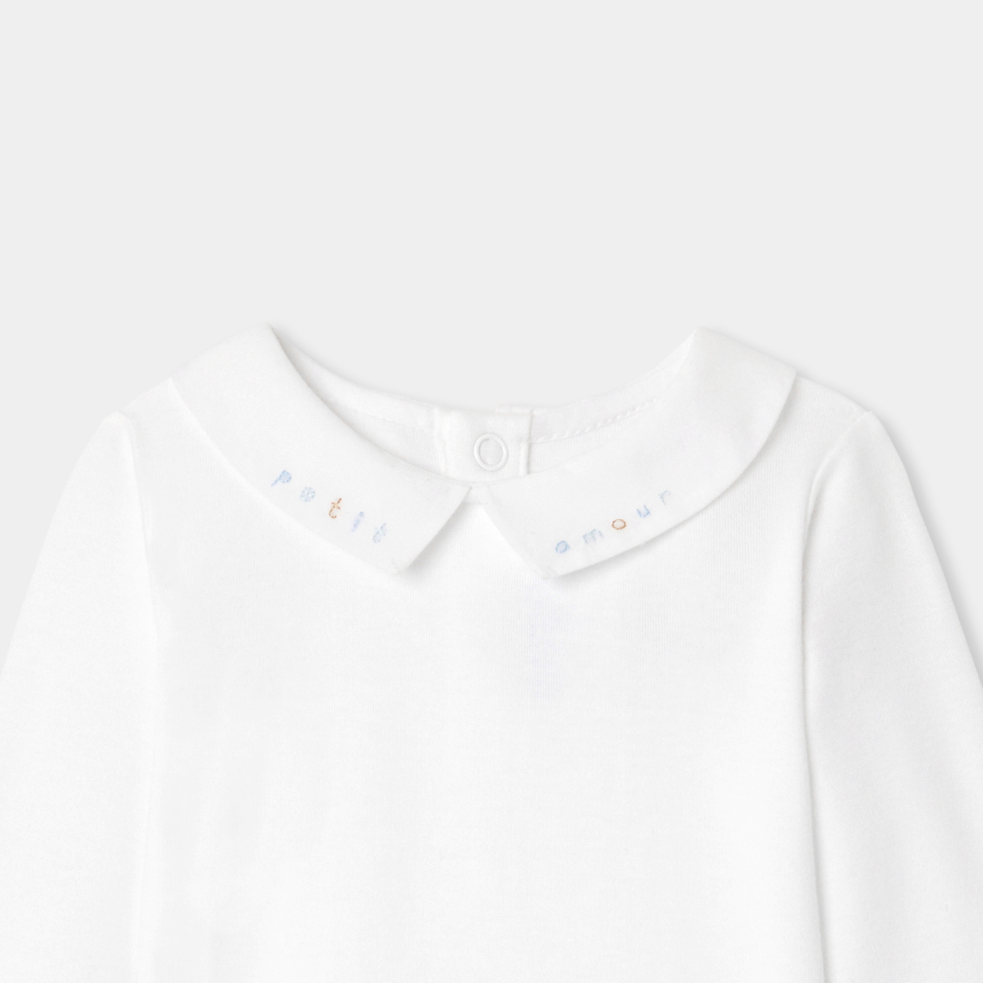 Classic and versatile, this baby boy bodysuit features a poplin collar hand-embroidered with a tender message. Made from soft, supple organic interlock cotton, snaps at the back and crotch make dressing easy. A long-sleeved bodysuit for everyday wear under a jumpsuit or comfort set.- Long-sleeved baby boy bodysuit in organic cotton- Hand-embroidered cotton poplin collar- Back and crotch snaps