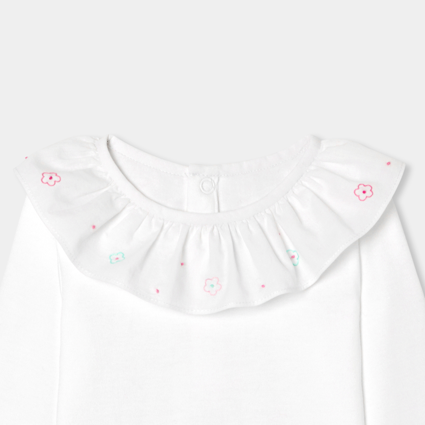 With a hand-embroidered ruffle and soft organic cotton, this baby girl bodysuit promises elegant everyday comfort. Long-sleeved and easy to slip on, this model, to be worn from autumn onwards, will go equally well with overalls or velvet shorts.- Organic cotton baby girl bodysuit- Long sleeves- Hand-embroidered poplin ruffle- Press studs at back and crotch.
