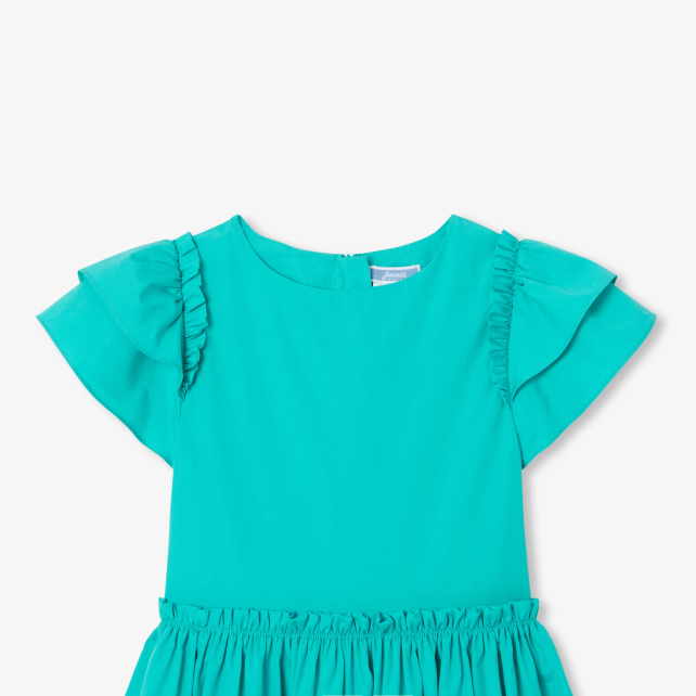 This girl dress multiplies geometric details for spring. Crafted in cotton poplin dyed a vibrant emerald green, ruffled sleeves and gathered details add an extra touch of style to this romantic piece designed to welcome the sunny days.- Girl dress in organic cotton poplin- Ruffled sleeves- Gathered waist- Cotton lining- Invisible zip opening at back