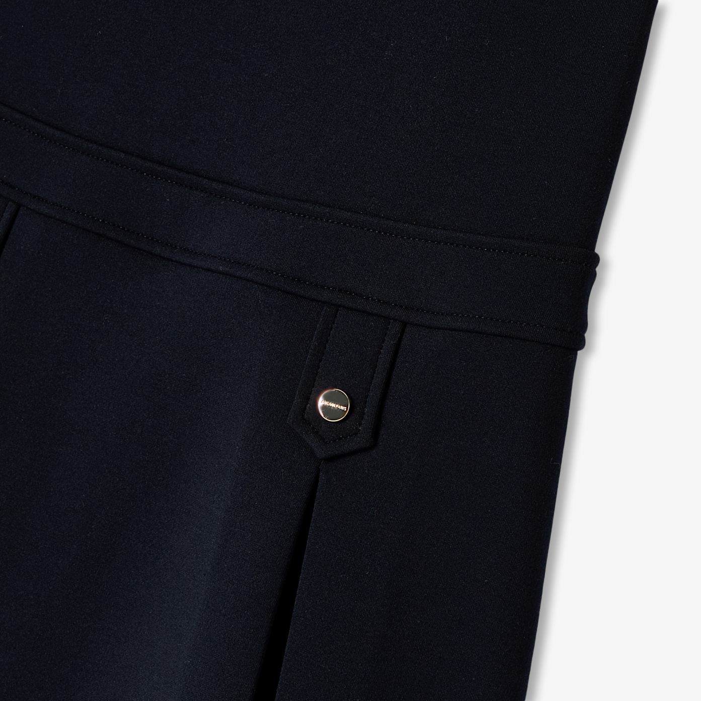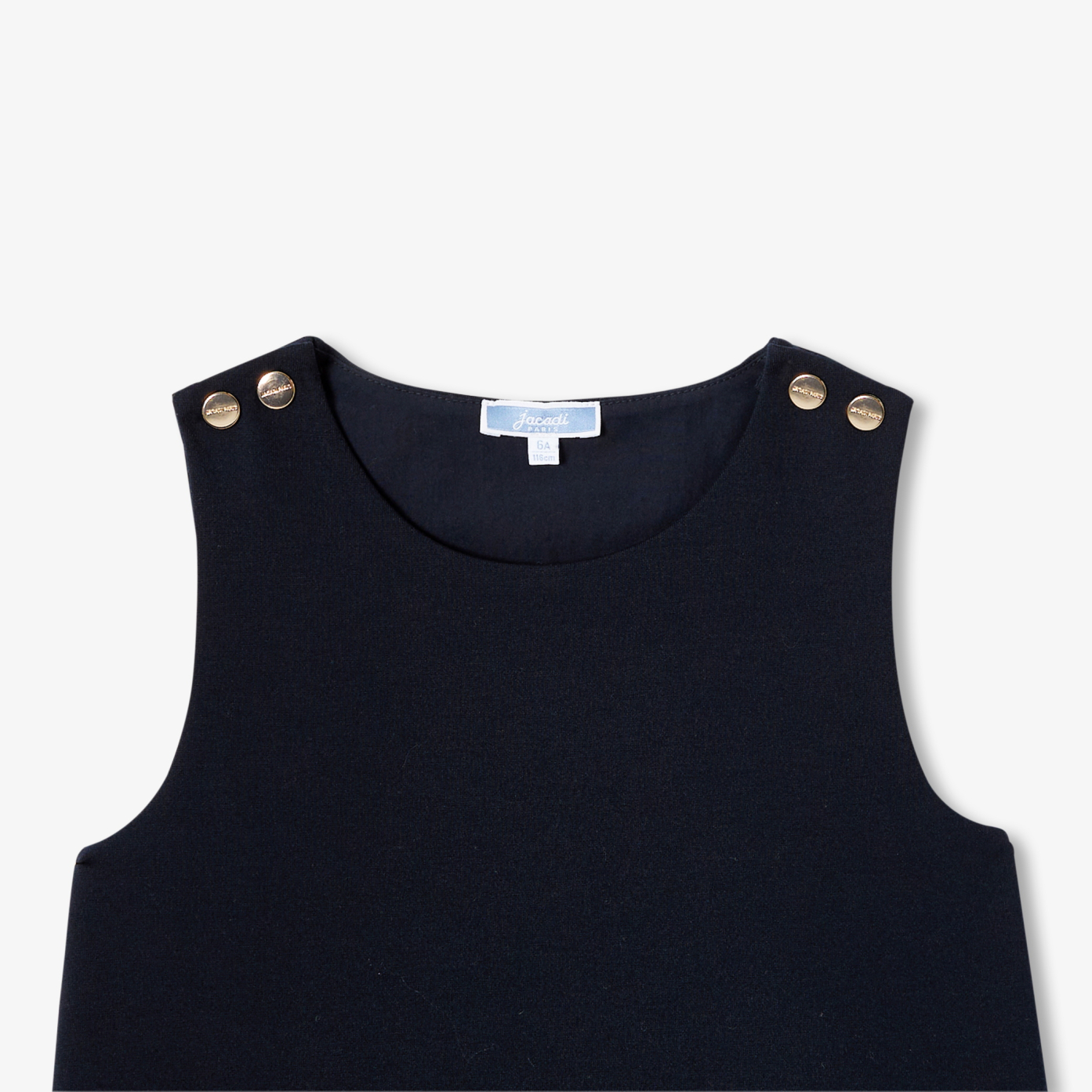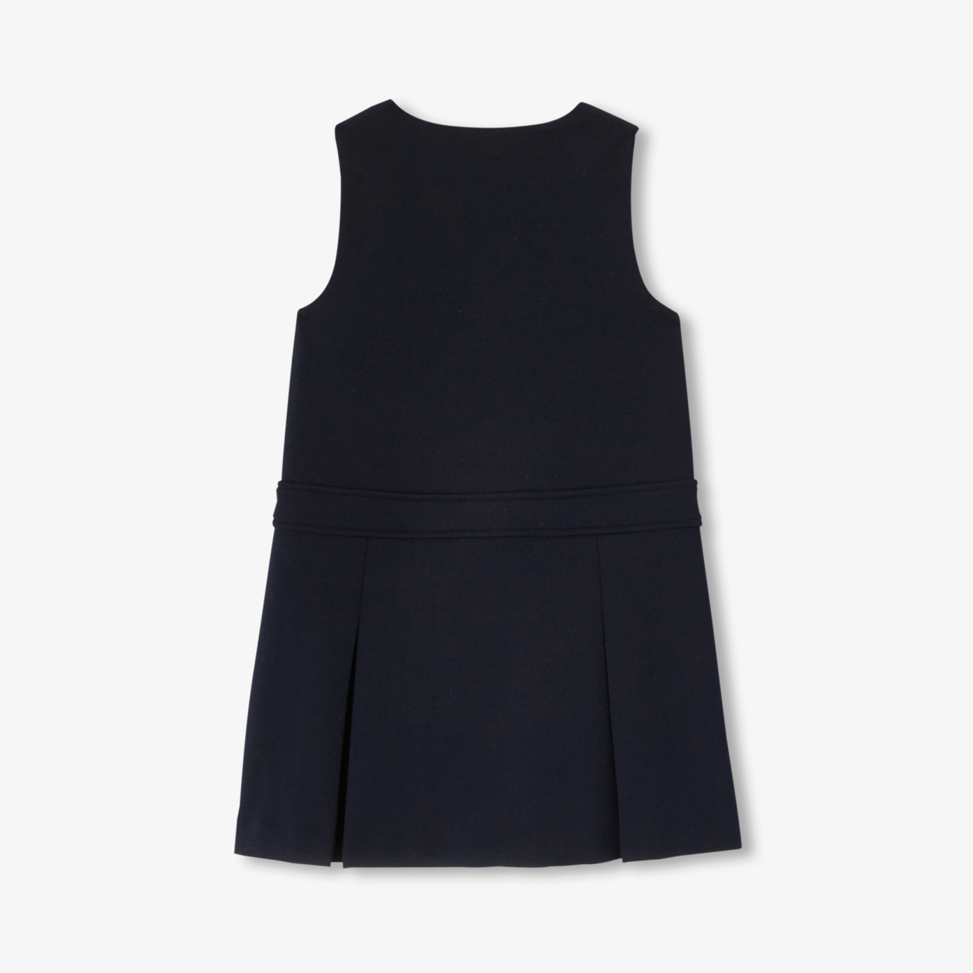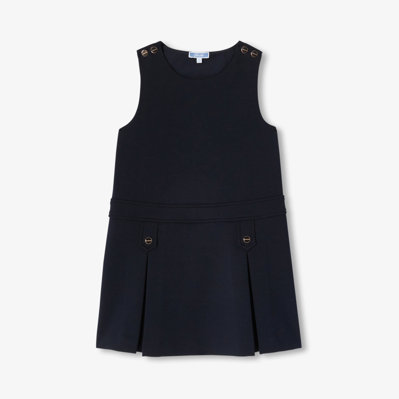 Full of couture spirit and style, the girl pinafore dress opts for a 60's look. In soft, comfortable Milano knit, with a marked waist, box pleat and gold buttons, this dress is ready to wear over a collar t-shirt for a chic, Parisian back-to-school silhouette.- Pinafore dress in Milano knit- Press-on shoulder opening- Cut-out waist- Fancy gold rivets at waist- Hollow pleat- Cotton lining