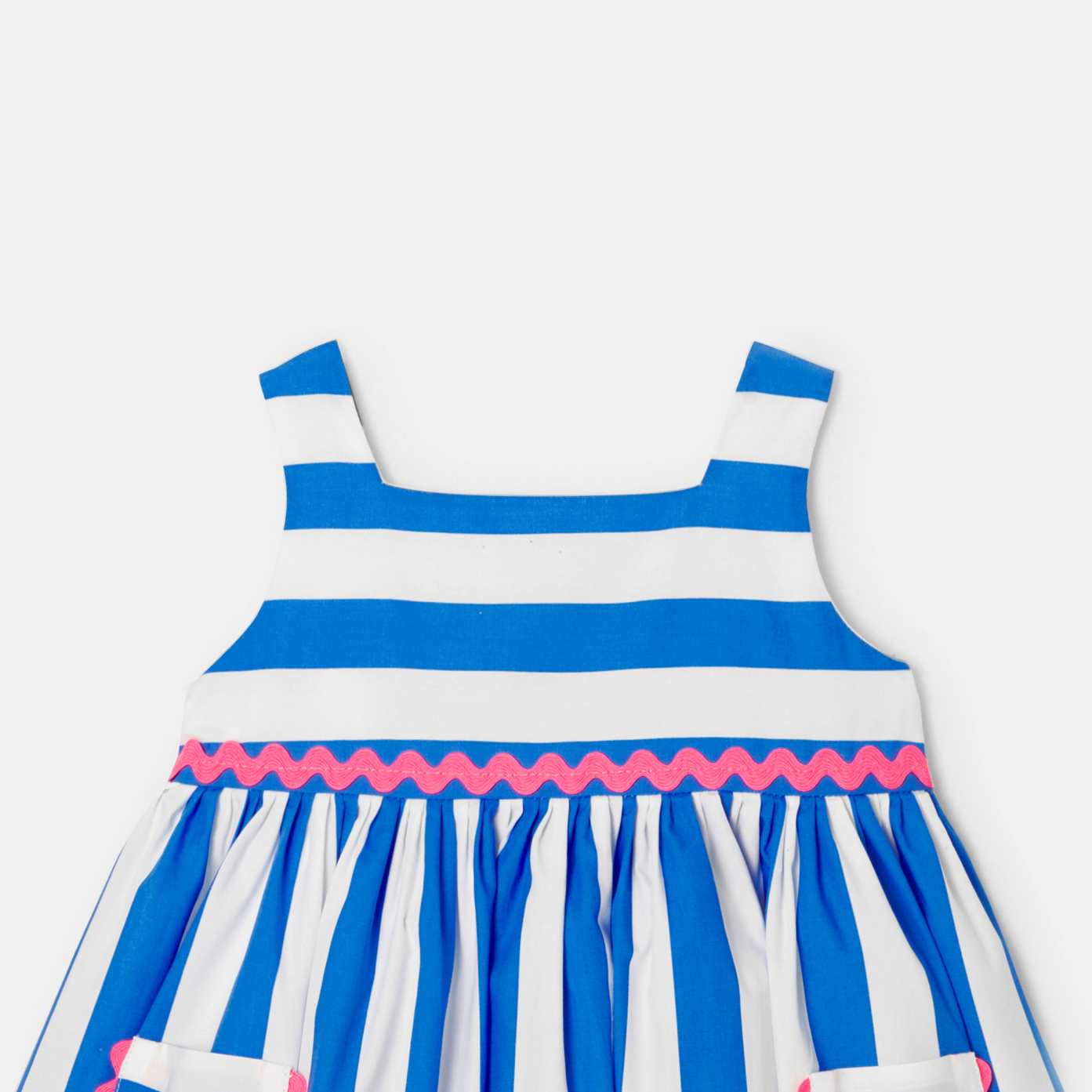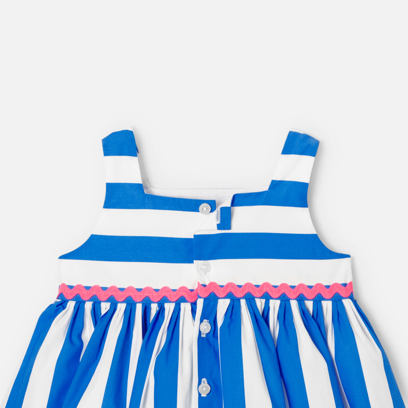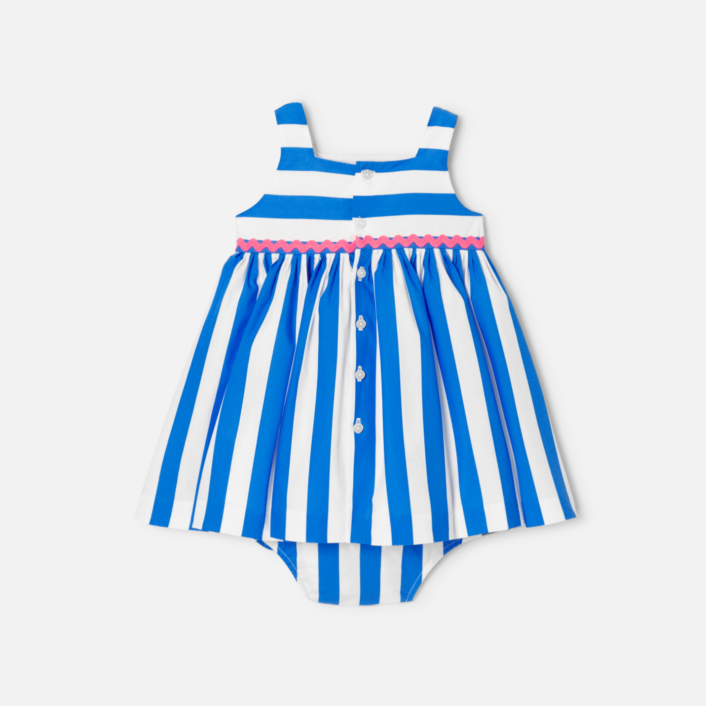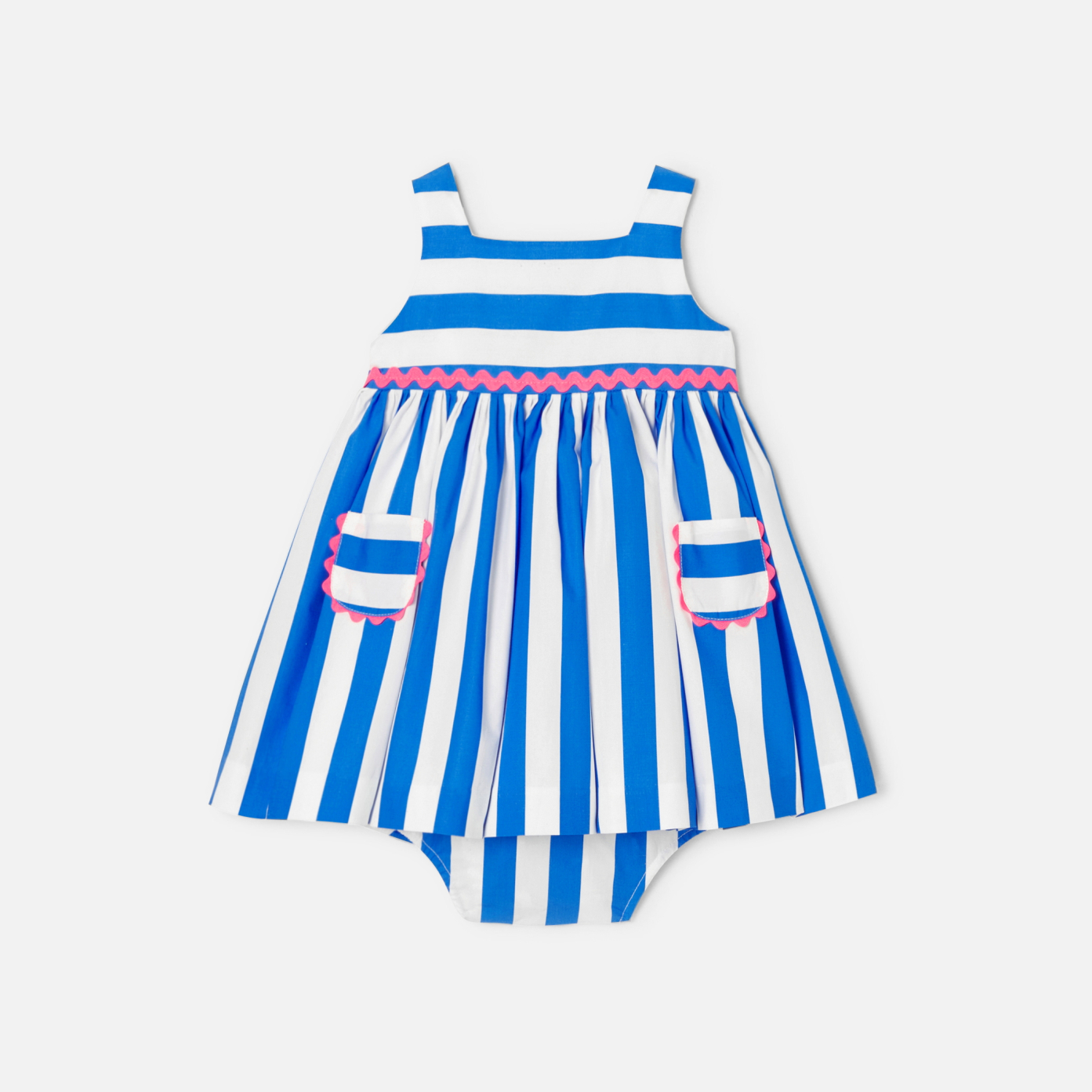Maxi stripes and neon croquet energise this baby girl dress. Modern and summery to perfection, this contemporary piece is accompanied by a bloomer to finish off the outfit with elegance.- Cotton baby girl dress- Square neckline- Patch pockets- Neon pink croquet ribbon trim- Buttoned back opening- Coordinating elasticated bloomer.