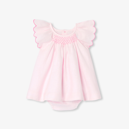 Inspired by the romantic wardrobe, this baby girl dress reveals all its charm. In cotton poplin embroidered with delicate flowers, gathers at the neckline for lovely volume and scalloped ruffled sleeves structure this lined dress, perfect for a ceremony. Complete with an elasticated bloomer, it is easy to wear every day.-Organic cotton baby girl dress-Embroidered flowers-Ruffled sleeves-Scalloped neckline-Lined with cotton voile-Open back-Ideal for birth gifts and formal wear