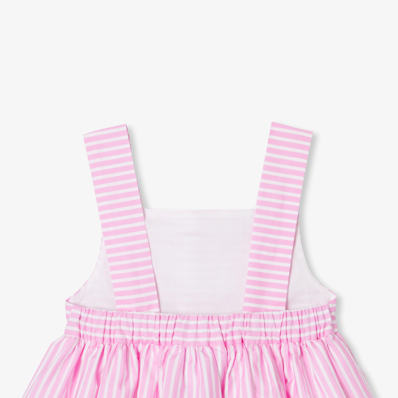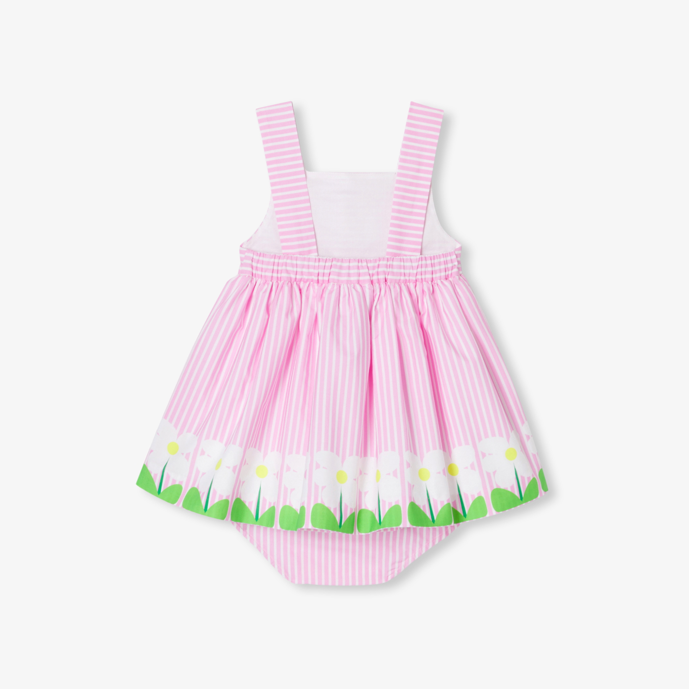 The baby girl dress takes us on a stroll through a colourful, floral universe for summer. Sleeveless and cross-backed, the designers have used a new technique, printing only flowers on the base of this striped dress. Lined in cotton voile and complete with bloomers, this jewel of savoir-faire will accompany the little girl from spring to late summer, for ceremonies and vacations.-Sleeveless baby dress in organic cotton-Crossed-back straps-Gathered cut-out at waist for lovely volume-Flowers on base-Lined in cotton voile-Matching elasticated bloomers