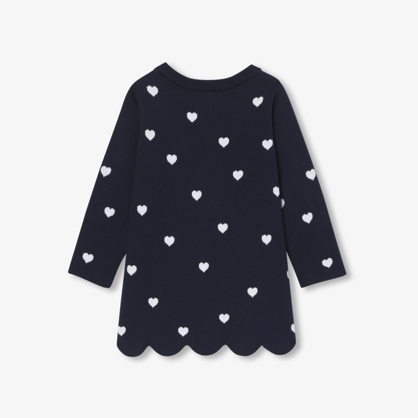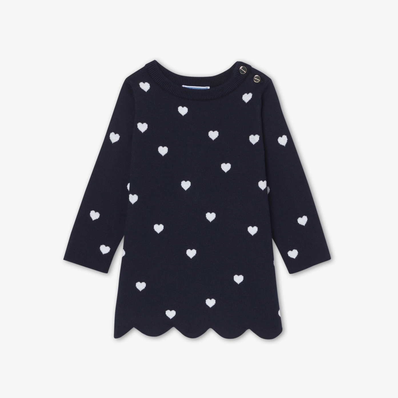 Little hearts and pretty scallops, this baby girl dress promises chic everyday comfort. Made from soft, supple organic cotton knit, it slips easily over a bodysuit thanks to its button placket at the shoulder. Pair it with an mid-season coat or an raincoat for back-to-school and all upcoming activities.- Baby long-sleeve dress- Organic cotton- Heart Jacquard- Button opening at shoulder- Scalloped base