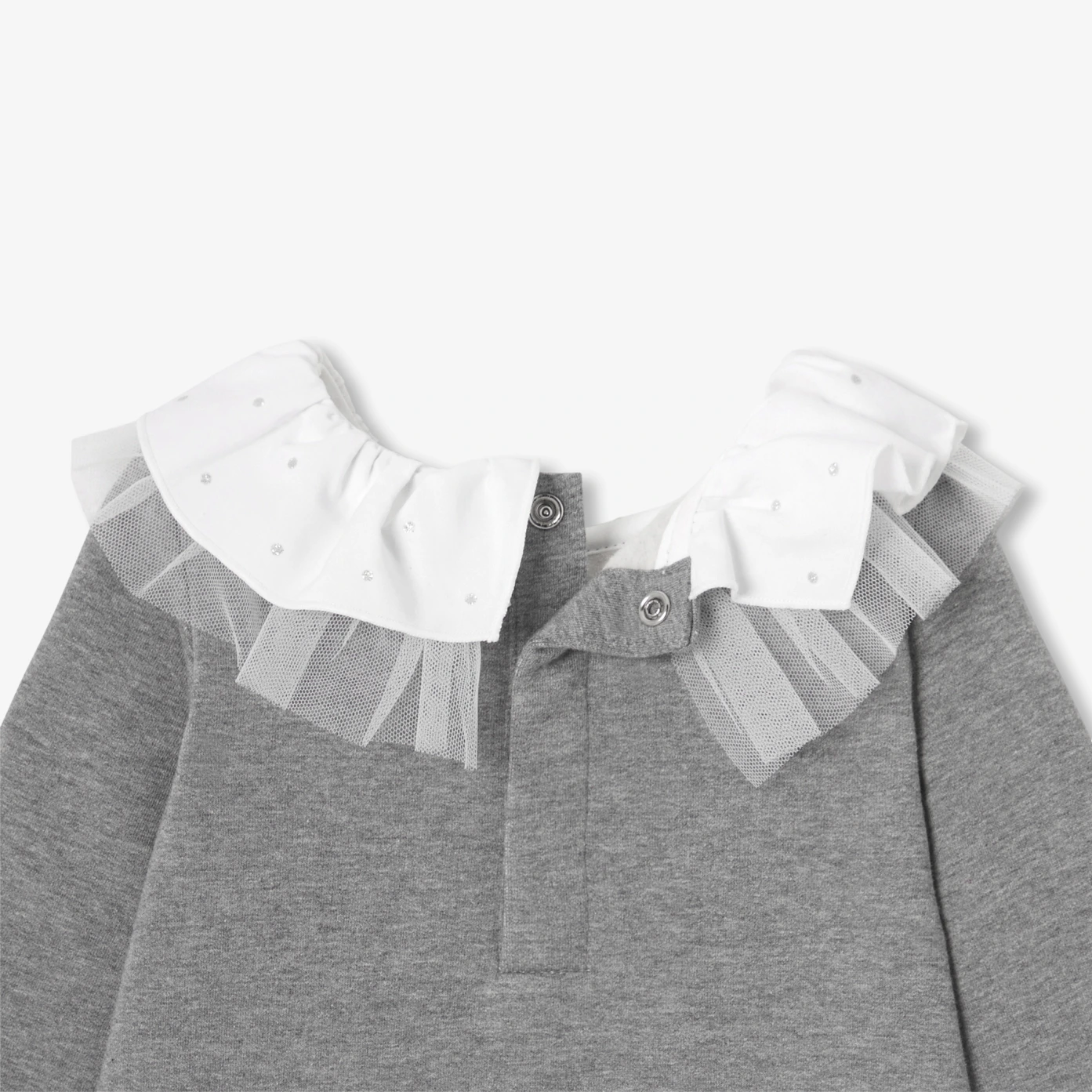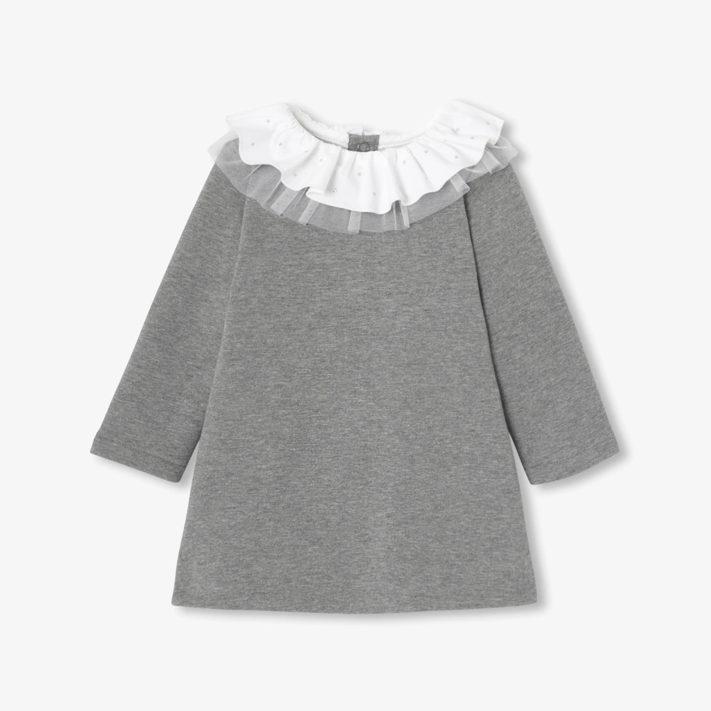 Combining the comfort of fleece with the modern elegance of a detailed neckline, this baby girl dress gains in modernity for winter. Soft and easy to slip on, it features a double ruffle in poplin and a removable tulle with silver polka dots. Worn with tights and pretty Mary Janes for the festive season, it is a great gift to give.- Organic cotton fleece baby girl dress- Long sleeves- Double ruffle- Poplin ruffle- Removable tulle ruffle with silver polka dots- Back snap opening