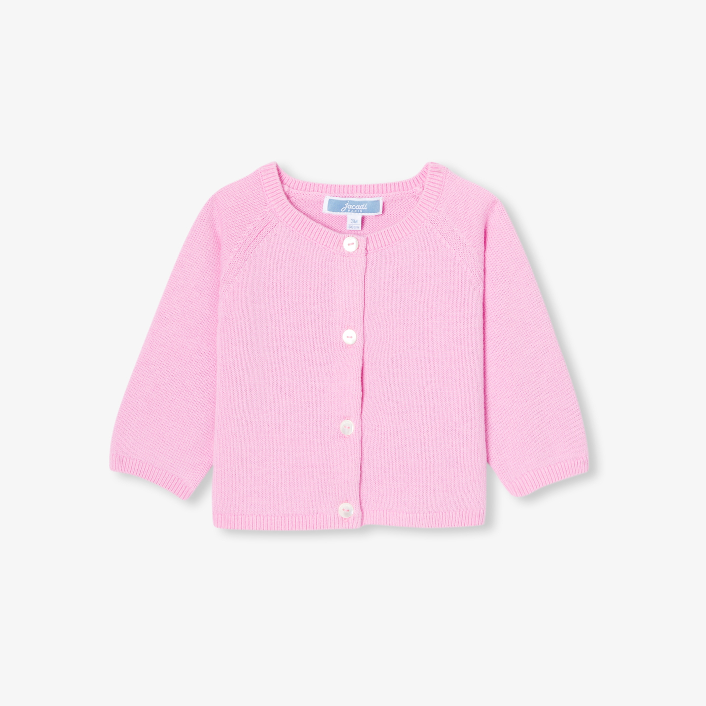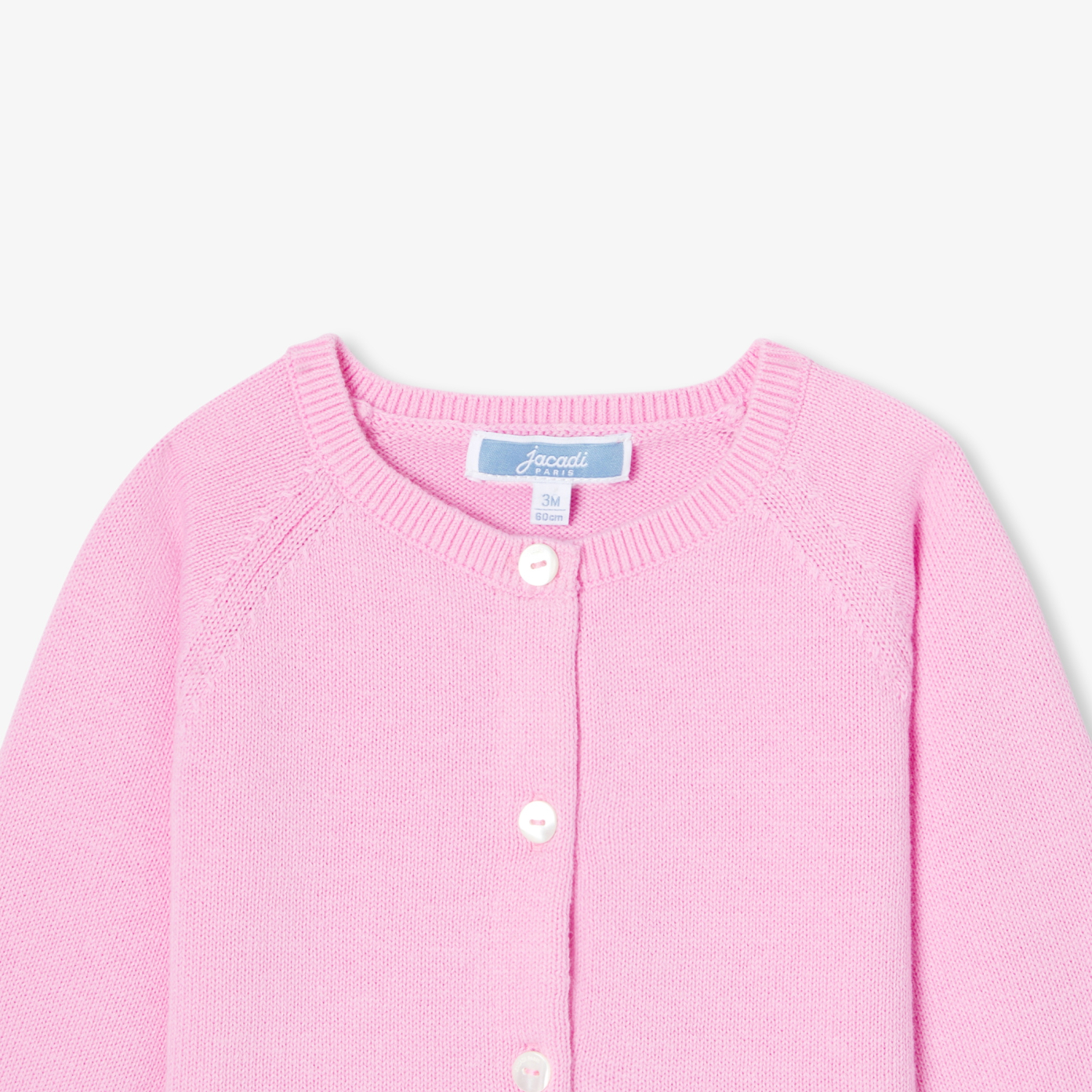 This cotton baby girl cardigan brings softness and a touch of colour to everyday outfits. Knitted in jersey stitch, it features openwork details on the armholes and natural mother-of-pearl buttons. Perfect over a dress or jumpsuit, this timeless, versatile model will accompany baby in style throughout the season.- Baby girl organic cotton cardigan- Soft, supple jersey knit- Openwork details on armholes- Natural mother-of-pearl button opening.