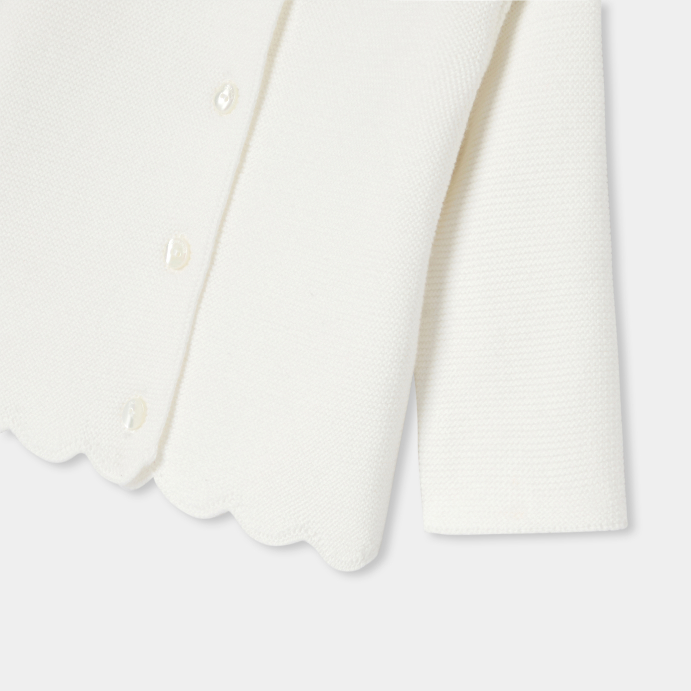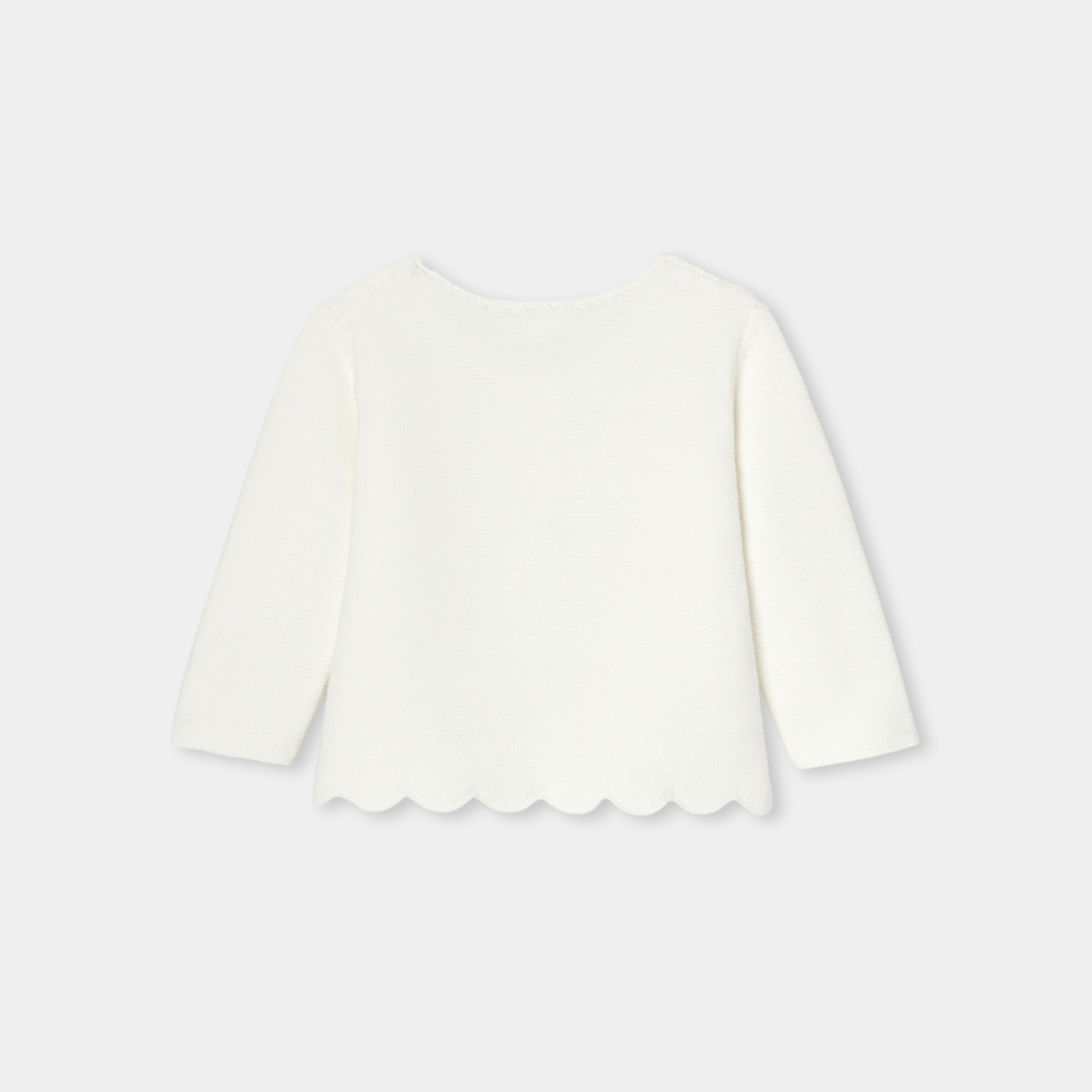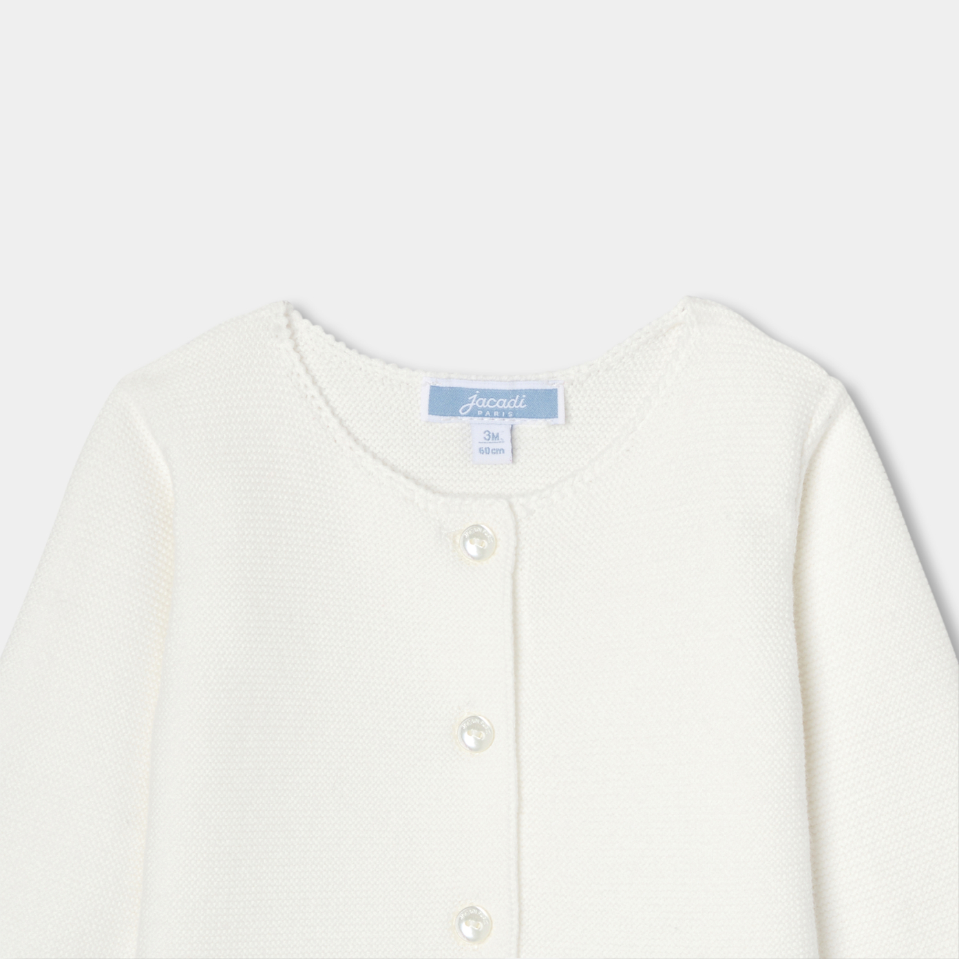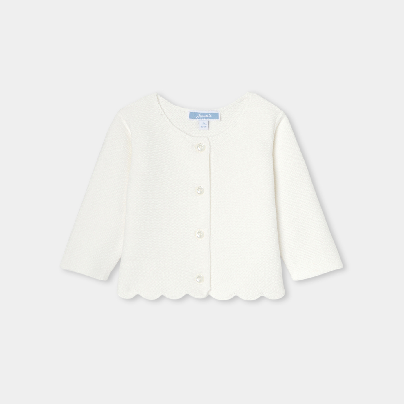 A must-have for the new-season wardrobe, this baby girl cardigan is available in soft, supple cotton. Knitted in garter stitch, with a scalloped base and natural mother-of-pearl buttons, this model is perfect for everyday wear. Worn over a blouse or dungarees, its soft pink hue will complement Jacadi's collection.- Baby girl organic cotton cardigan- Soft, supple garter stitch knit- Scalloped base- Natural mother-of-pearl button opening.
