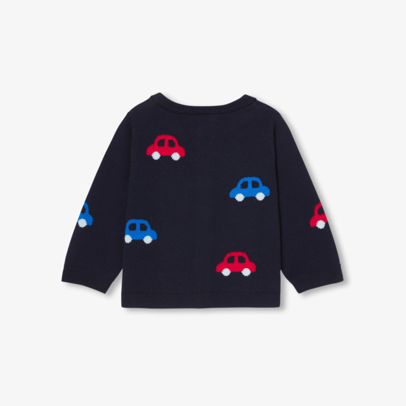 With its soft, supple double-knit fabric and playful pattern, this baby cardigan transports you into a colourful, geometric world that baby will love. Animated by cars and little mice, match it with denim overalls and ankle boots for a city silhouette full of charm.- Double-sided knit cardigan- Car and mouse motifs- Natural mother-of-pearl button opening- Ribbed finishings.