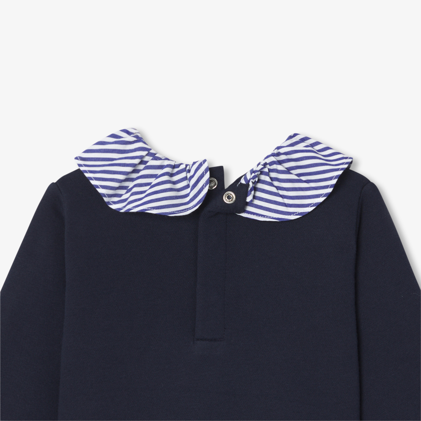 This baby girl sweatshirt combines the comfort of soft fleece with the modern elegance of a striped ruffle. Easy to slip on thanks to its snap opening on the back, match this mid-season wardrobe essential with jeans and trainers for an effortlessly chic casual silhouette.- Organic cotton sweatshirt- Scratch fleece interior- Double gingham fabric collar- Snap opening on back