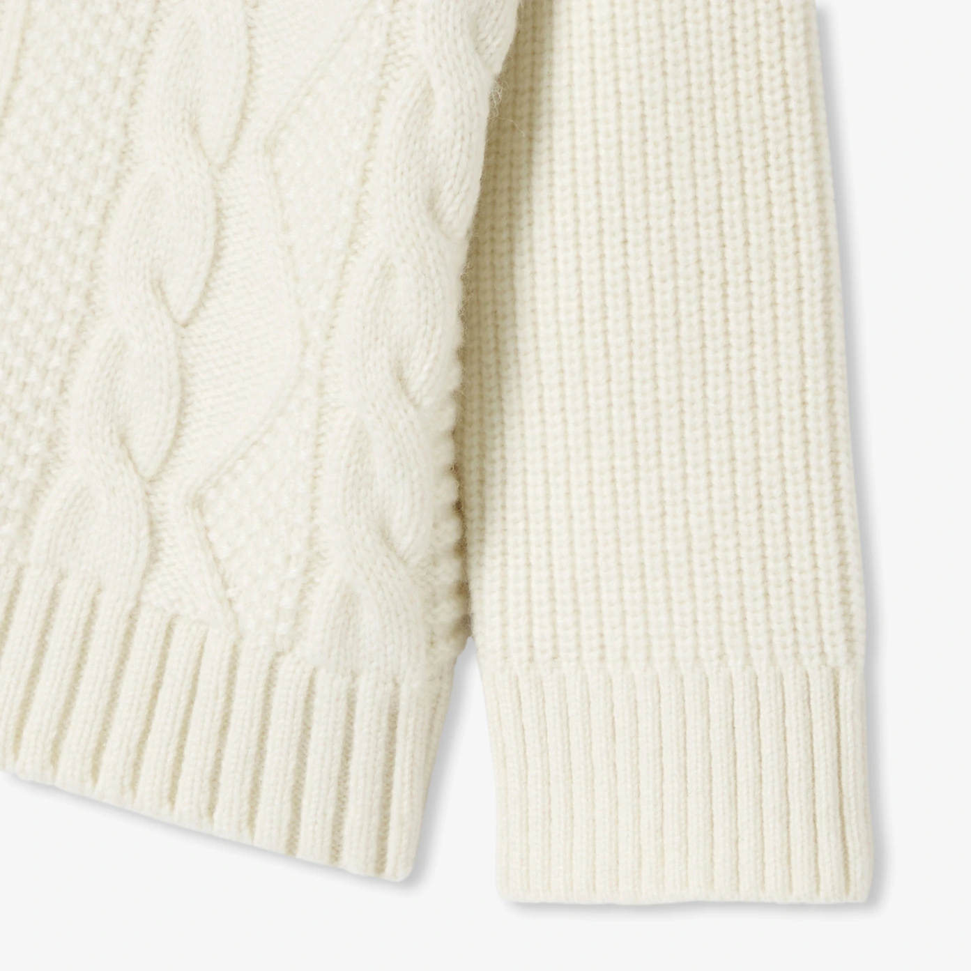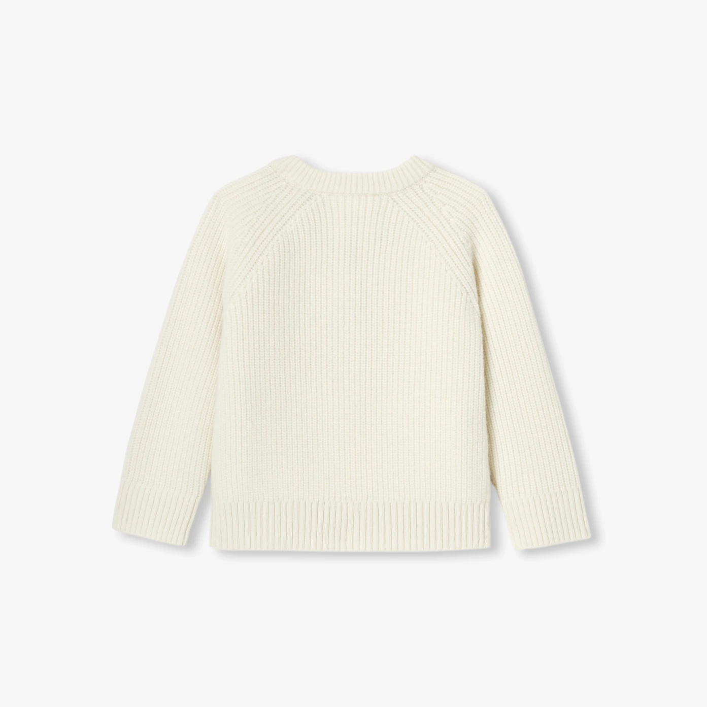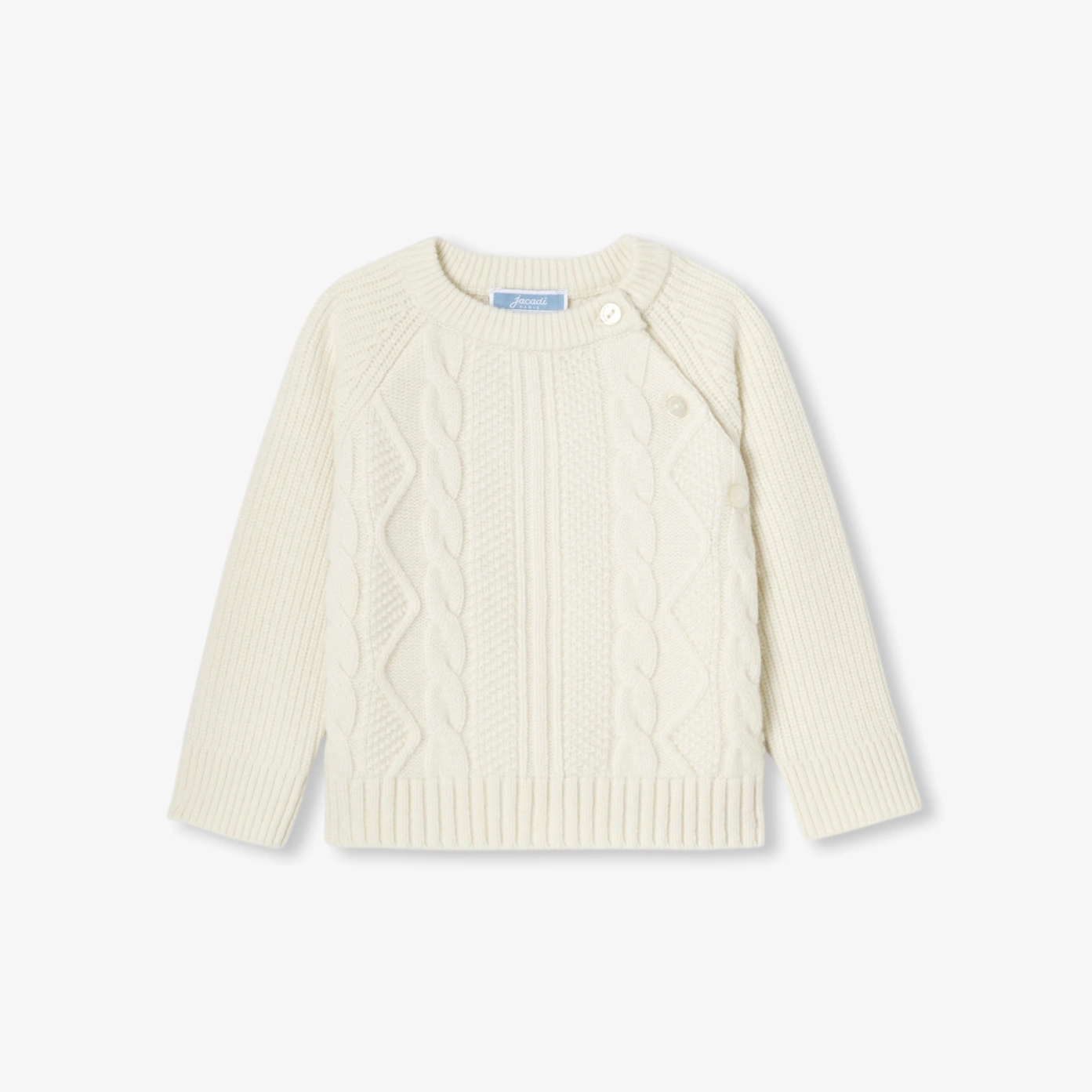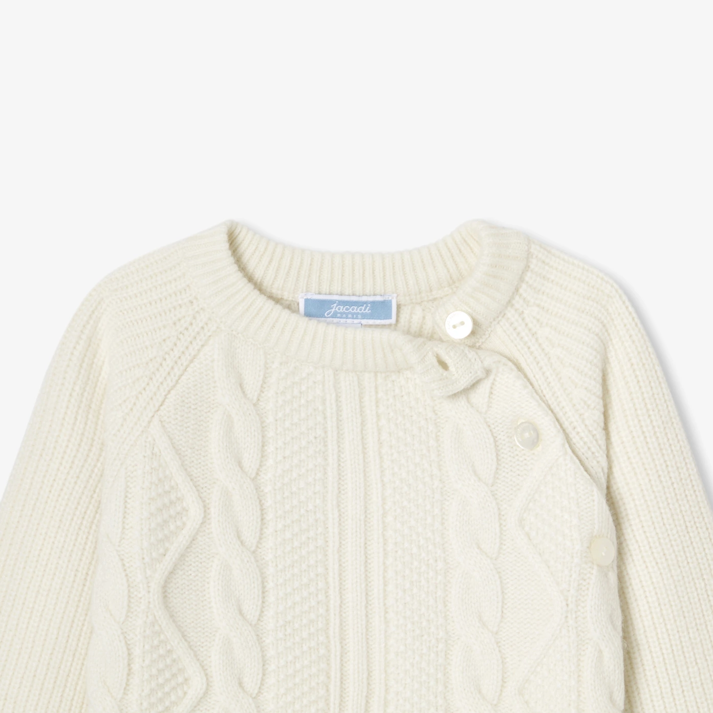 Available in sustainable wool and cashmere, this baby boy sweater is inspired by the chic tartan sweater. With its round collar and raglan sleeves, it combines the authenticity of a detailed knit with the pure elegance of a neutral colour. Worn with velvet trousers or jeans, this warm, cosy model will be part of every look.- Sustainable wool and cashmere sweater- Set of knitted stitches- Beaded ribbed sleeves and back- Raglan sleeves- Raglan buttoned opening