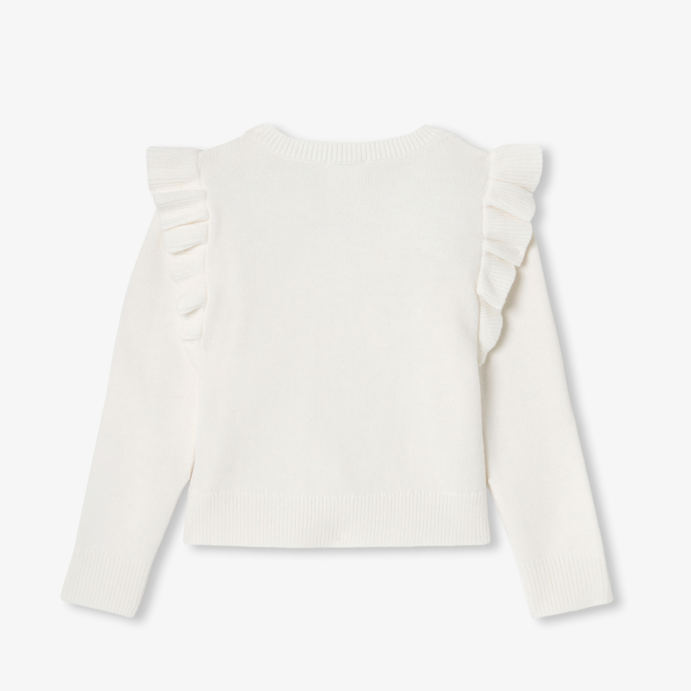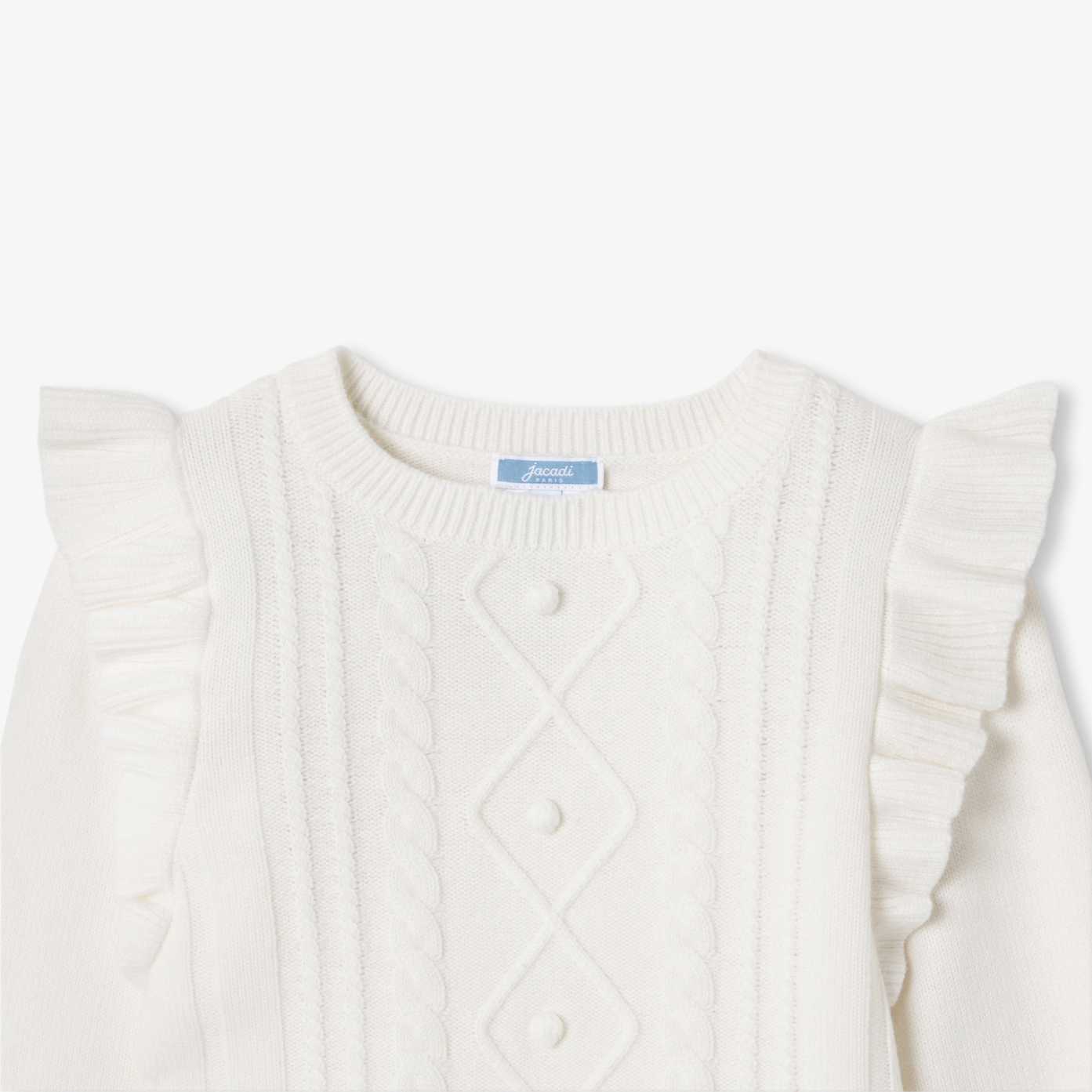 Inspired by the iconic Irish jumper and reinterpreted in a romantic version, this girl sweater comes in sustainable wool for autumn. Sublimated by a set of cables on the front and ruffles on the armholes for added modernity, its white colour will pair perfectly with pink velvet trousers and ankle boots for everyday wear.- Sustainable wool sweater- Set of cables on the front- Ruffled armholes