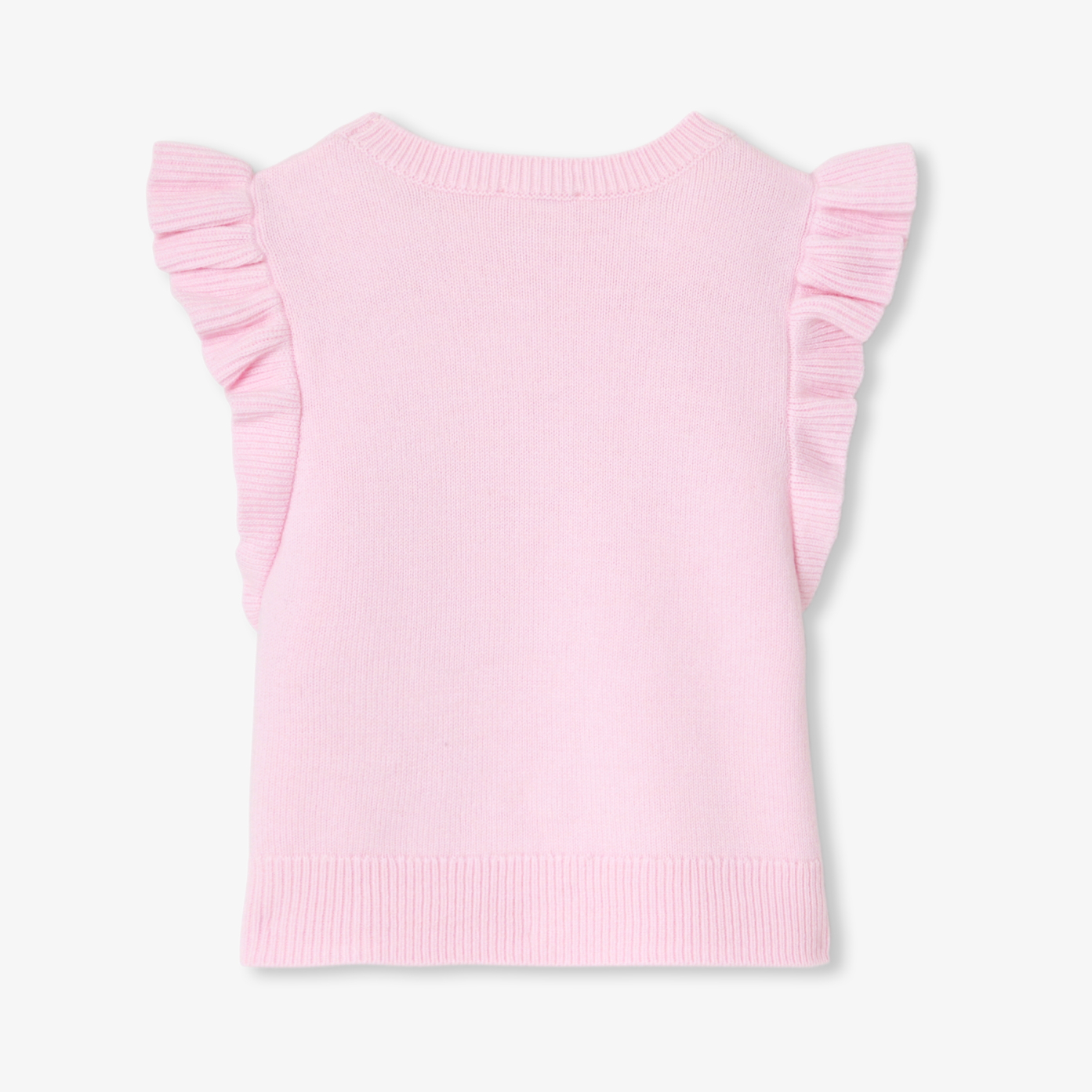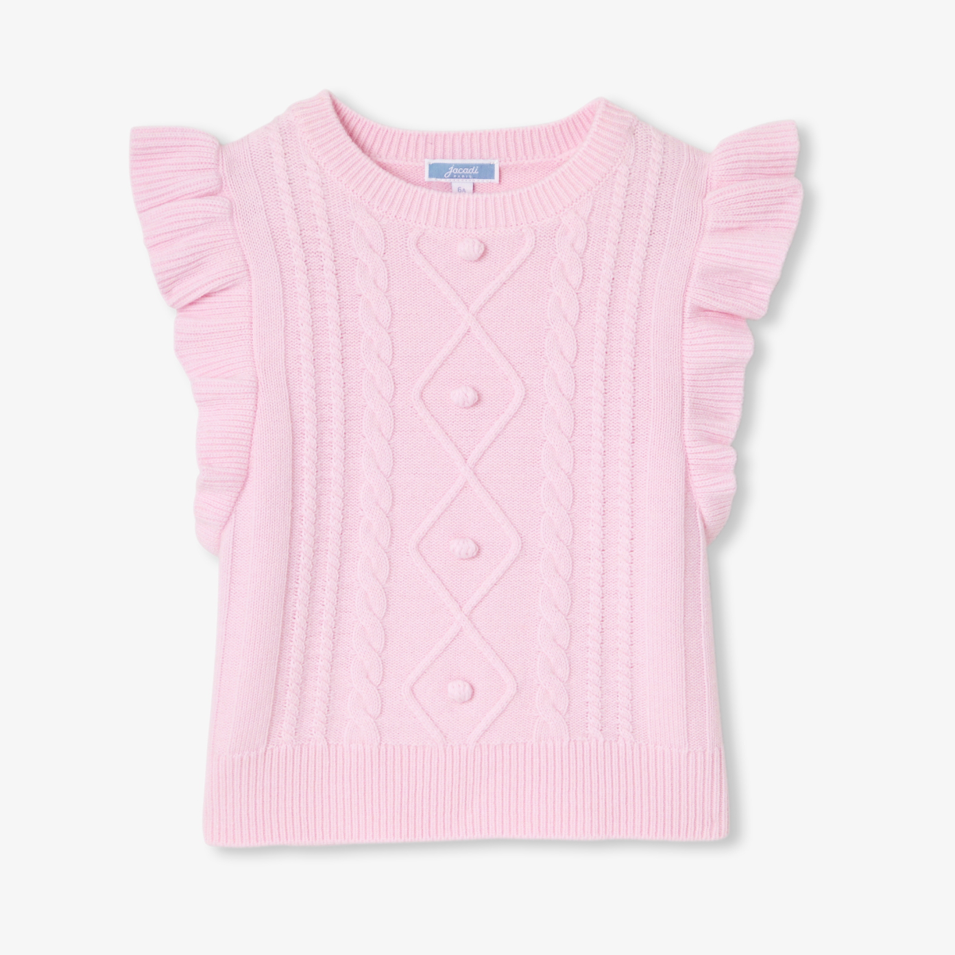 Ever more chic and romantic, the little girl's wardrobe is enriched by contemporary retro designs like this sleeveless girl sweater. Inspired by the Irish sweater with its cable knit, pretty ruffles energise this knit tank top to be worn over a t-shirt with shorts or wide-leg trousers for a very up-to-date city silhouette.- Sustainable wool sleeveless sweater- Set of cables on front- Ruffled armholes