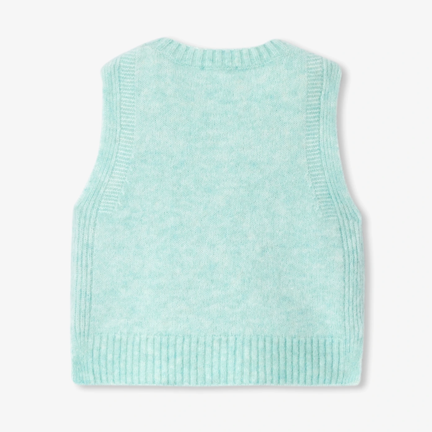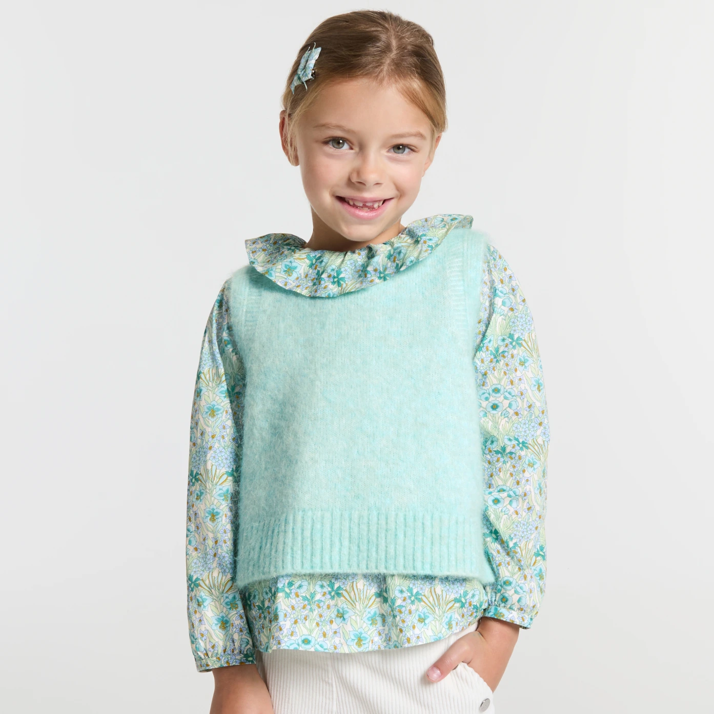 Combining comfort and minimalist elegance, the sleeveless sweater has become a winter essential. Declined in a new knit composed of sustainable wool and alpaca with a fluffy effect, layer this soft and warm model over a blouse in Liberty fabric with velvet trousers for a chic and cosy silhouette.- Girl sleeveless sweater- Sustainable wool and alpaca- Fluffy knit- Bottom slits