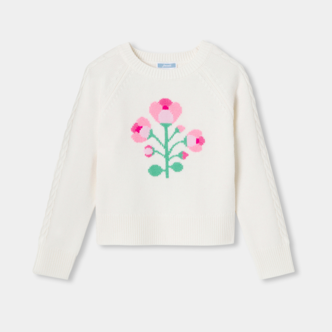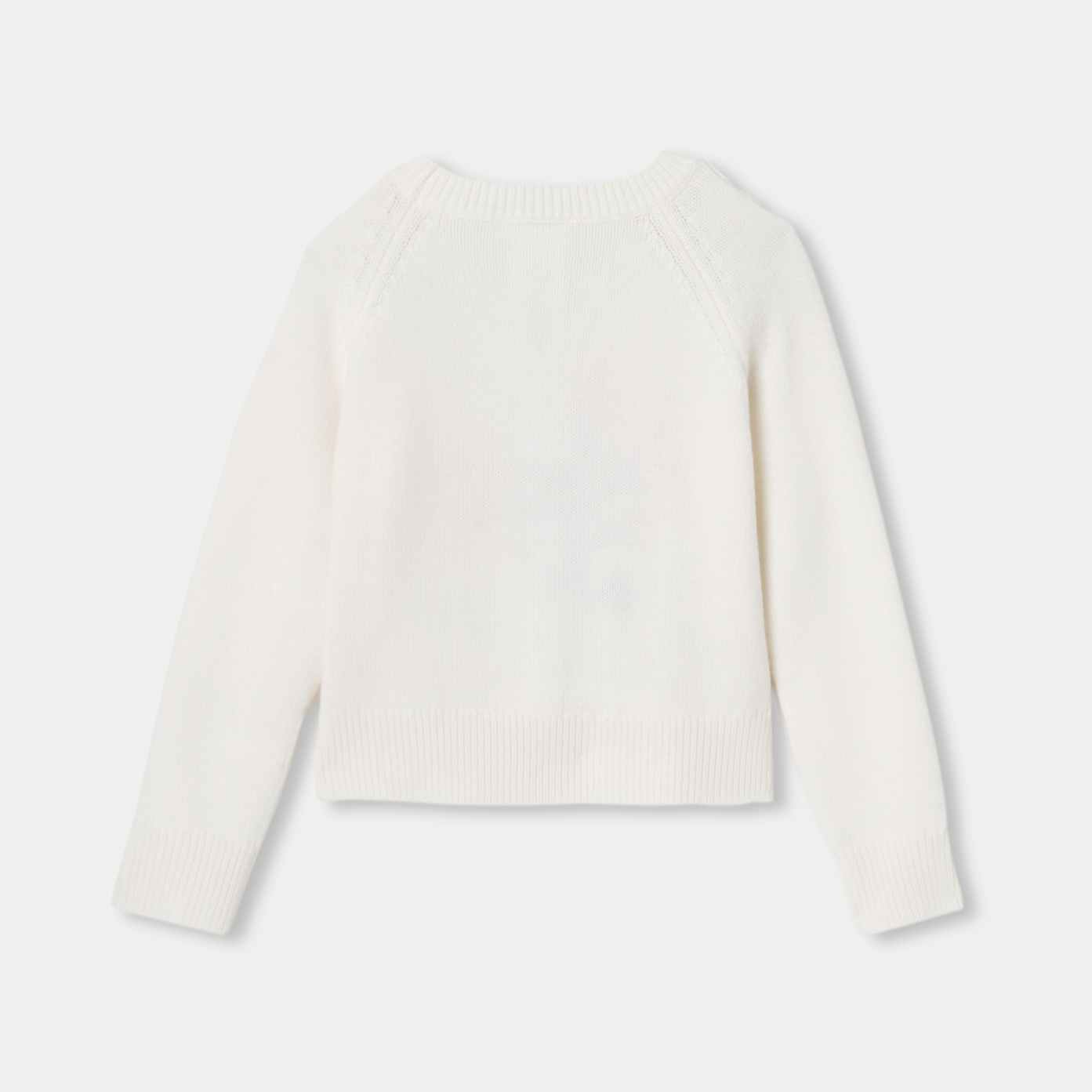 A must-have for your winter wardrobe, this girl sweater transports you into a cosy, romantic world. Made from soft, full-coverage wool, it is embellished with a delightful bouquet of flowers in art nouveau intarsia and twists on the sleeves. This season favourite to wear with herringbone shorts or velvet trousers, it will add a chic touch to any outfit.- Girl wool sweater- Raglan sleeves- Intarsia bouquet of flowers- Twists on sleeves- Buttoned back opening
