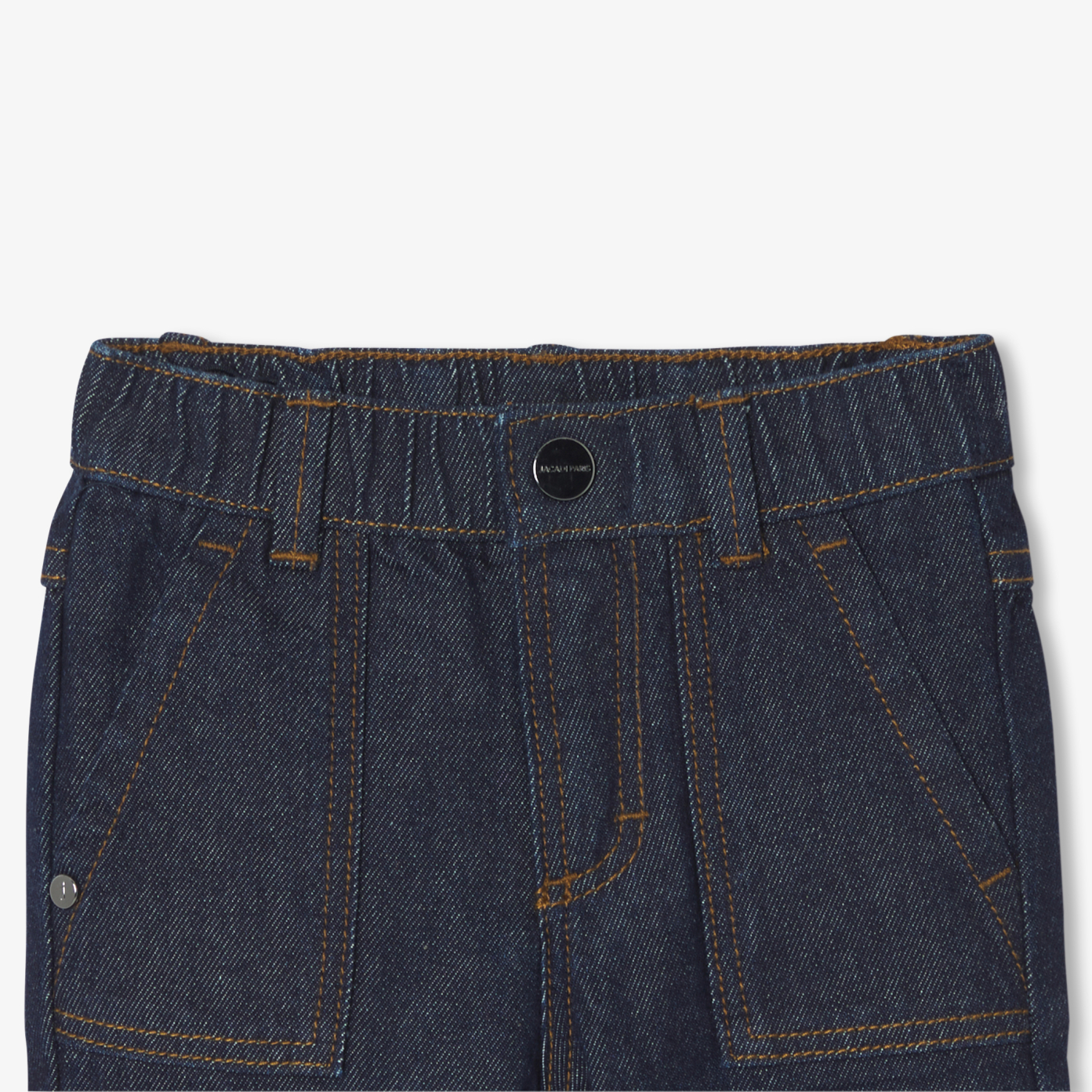 Inspired by Japanese canvas jeans, these baby jeans combine the authenticity of raw denim with the modernity of cargo pockets and cuffs. Sturdy and comfortable, with an adjustable elasticated waistband, this model for urban kids will go equally well with a shirt or a trucker sweater in the fall.- Raw denim baby jeans- Japanese canvas spirit- Worker pockets- Lower leg turn-ups- Adjustable elasticated waistband