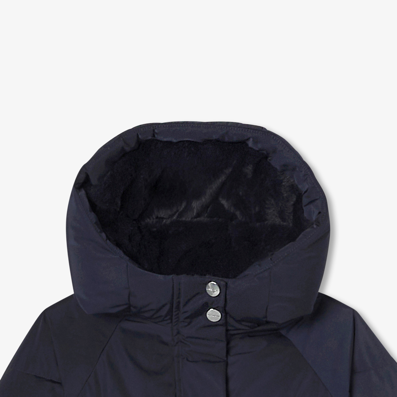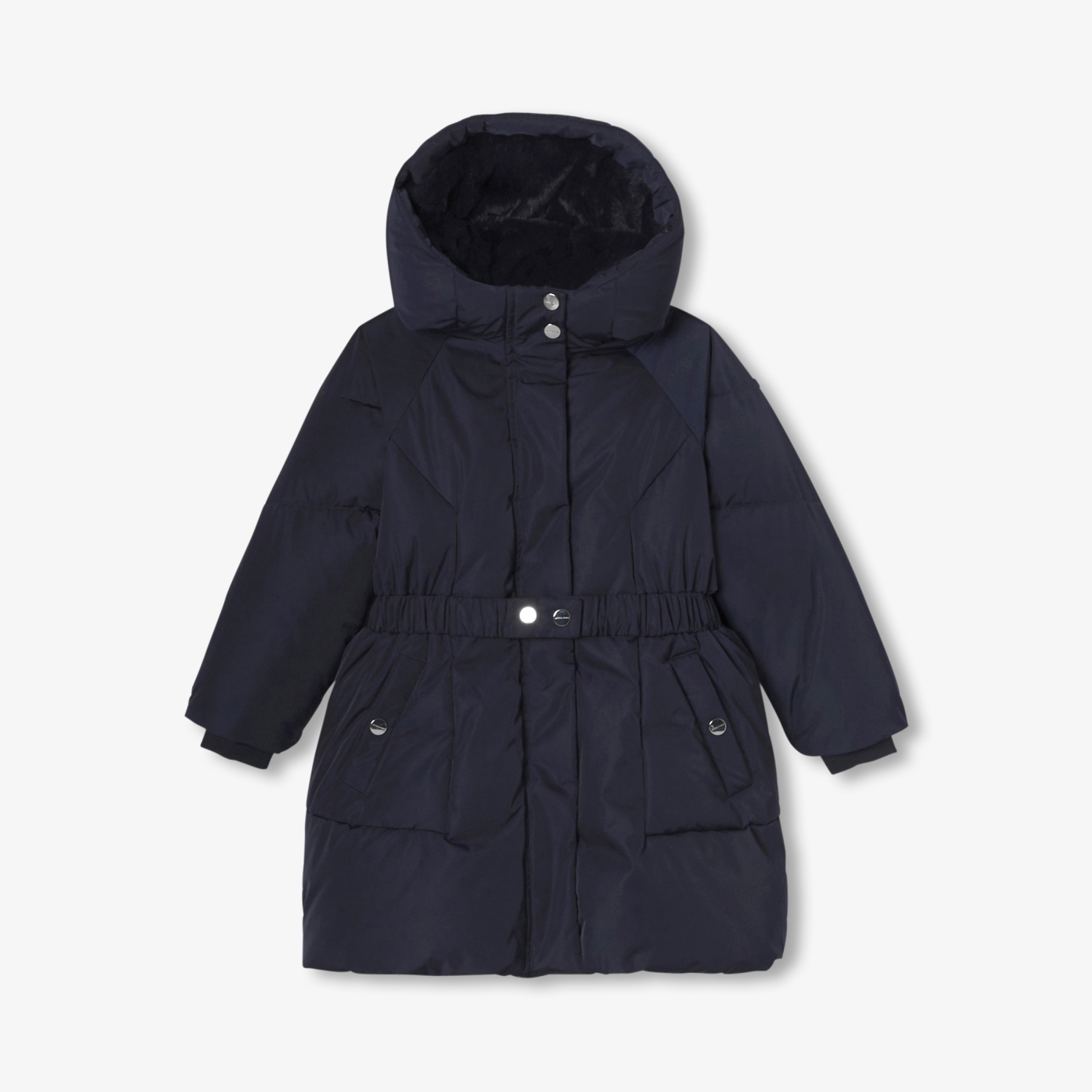 Chic and urban, our girl down jacket is cut long and tightened at the waist for a contemporary silhouette. Ideal for warding off the first cold snaps thanks to its feather and down filling, slanted pockets and zipped fastening complete this timelessly colourful piece perfect for everyday wear and vacations.- Long down jacket- Integrated hood- Tightened, elasticated waist- Zipped opening- Bias pockets- Geometric cut-outs- RDS-certified feather and down filling.