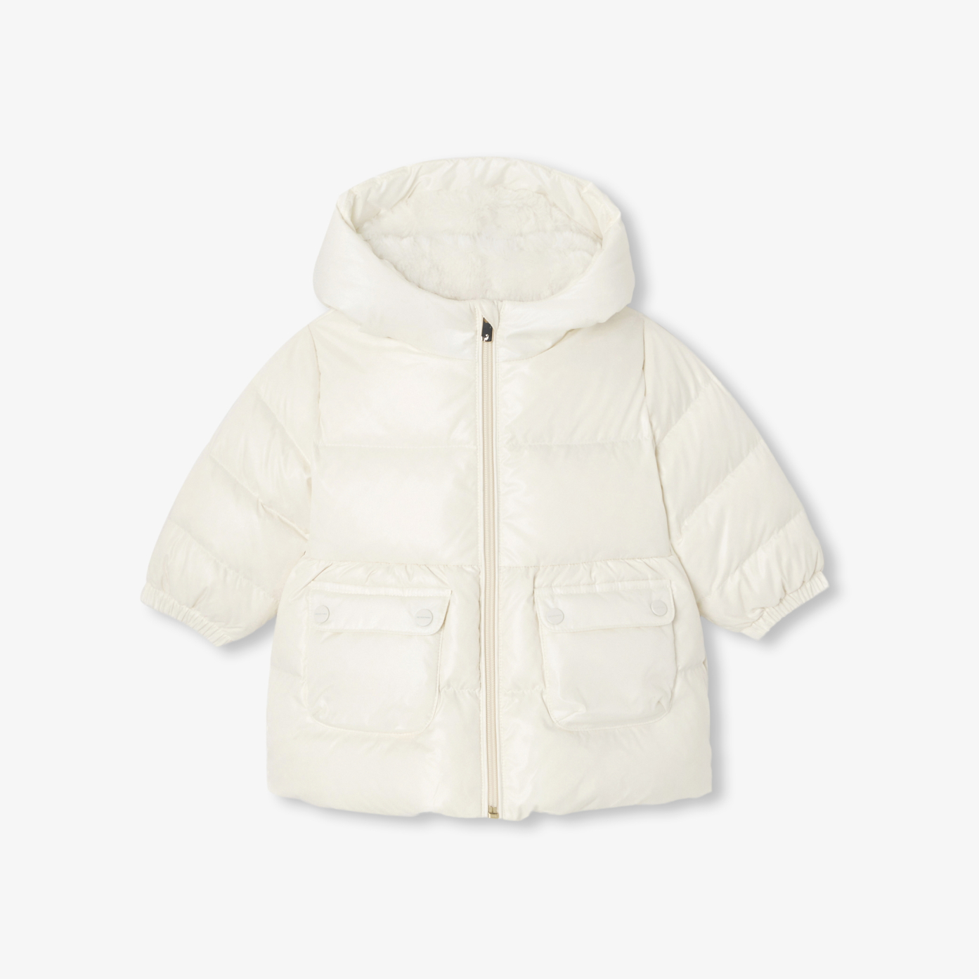 This baby girl down jacket strikes just the right balance between comfort and contemporary elegance. Slightly slim-fitting and buttock-length, feather filling and faux fur lining all the way to the hood offer enveloping warmth. Ideal for winter days, patch pockets with gold snap fastenings, elasticised cuffs and zip opening complete this practical yet essential piece. Discover it in timeless navy blue or oatmeal white for a resolutely chic look.- Bottom-length down jacket- Slightly fitted cut- Feather down filling- Faux fur lining- Patch pockets with gold press studs- Zipped opening- Elasticised cuffs- Zipped opening