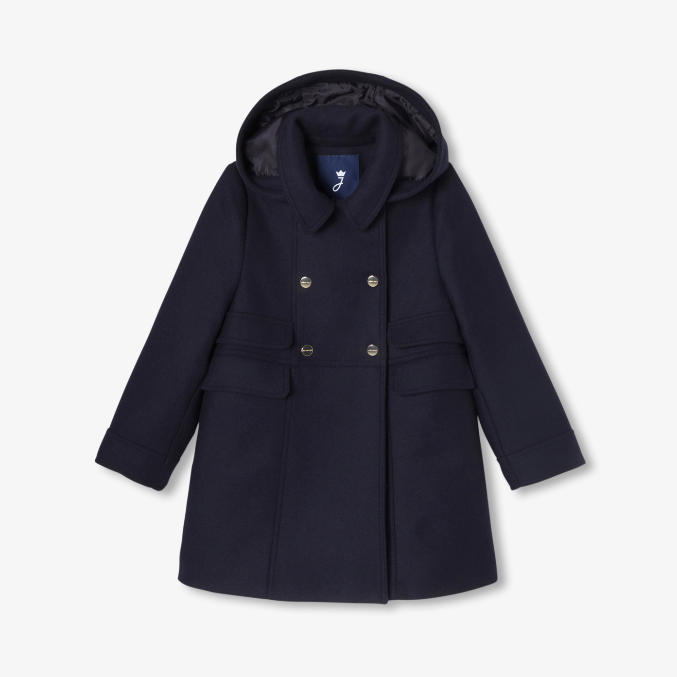 The back-to-school wardrobe is enriched by pieces as chic as they are practical, like this girl coat. A British-style coat in wool with trompe-l'œil pockets and real flap pockets, removable hood, lining and light wadding have been added for extra warmth. Worn over a denim dress or with wide-leg trousers and Mary Janes for a preppy, city look, it is perfect for everyday wear.- Girl wool coat- Lining and light wadding- Removable hood- Trunk pockets on bust- Real flap pockets below waist- Crossed opening with metallic snaps- Flared base