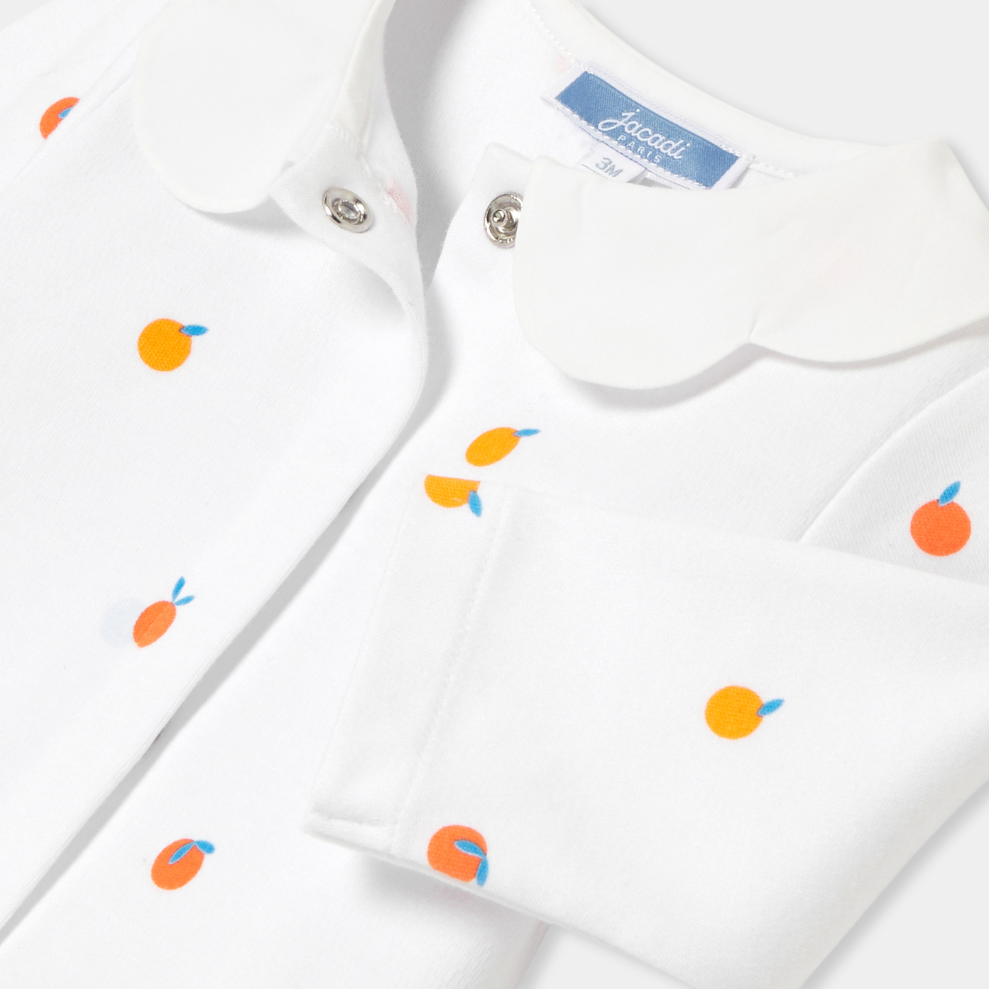 Chic, pop nights with these baby girl pyjamas in interlock. Lightweight and comfortable, easy to put on thanks to their front opening, scalloped collar and little oranges make these pyjamas a must-have to wear from spring with or without a bodysuit until the end of summer.-Baby girl sleepwear in organic cotton-Scalloped collar in poplin-Fancy pattern-Invisible front press stud opening-Great idea for a baby gift, either for yourself or as a present.
