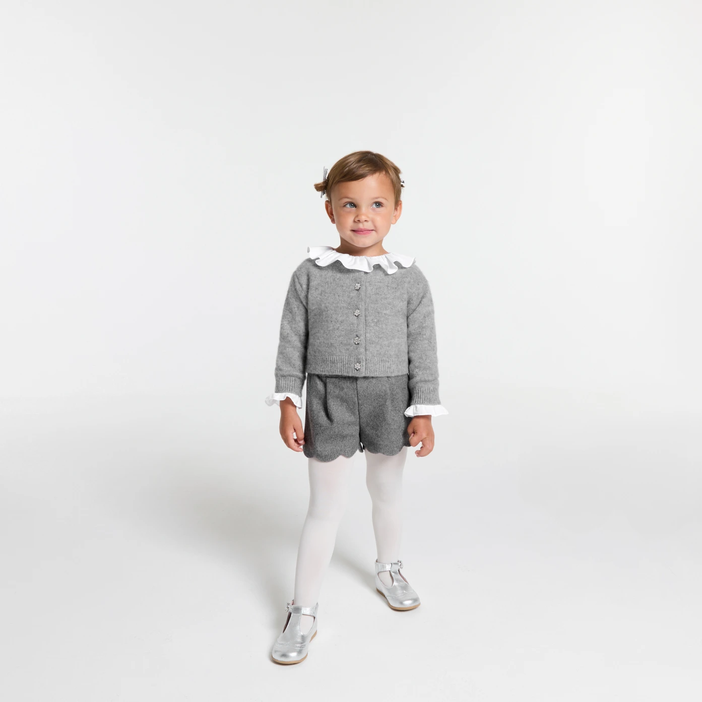 Minimalist cut and modern details for these baby girl shorts. Retro chic with scalloped legs and tab-style silver rivets, its soft, supple flannel adds extra style to this timeless piece. Worn by day over a long-sleeved bodysuit with a fleece cardigan, it will also make a festive holiday outfit when paired with a jeweled button cardigan.- Flannel baby girl shorts- Scalloped leg bottoms- Silver rivets at waist- Adjustable elastic waistband