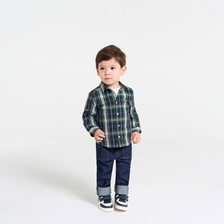 Inspired by the English wardrobe, this baby boy's shirt displays a delicate look and timeless charm for the start of the school year. Made from tartan with autumnal tones, it enchants with its understated elegance and meticulous details. Featuring branded buttons and a crowned J embroidery on the chest, this piece pairs perfectly with velvet trousers to create a chic and authentic silhouette. Baby shirt in refined tartan fabric Jacadi branded button opening Crowned J embroidery on the chest Soft and comfortable to wear Ideal for the first autumn looks