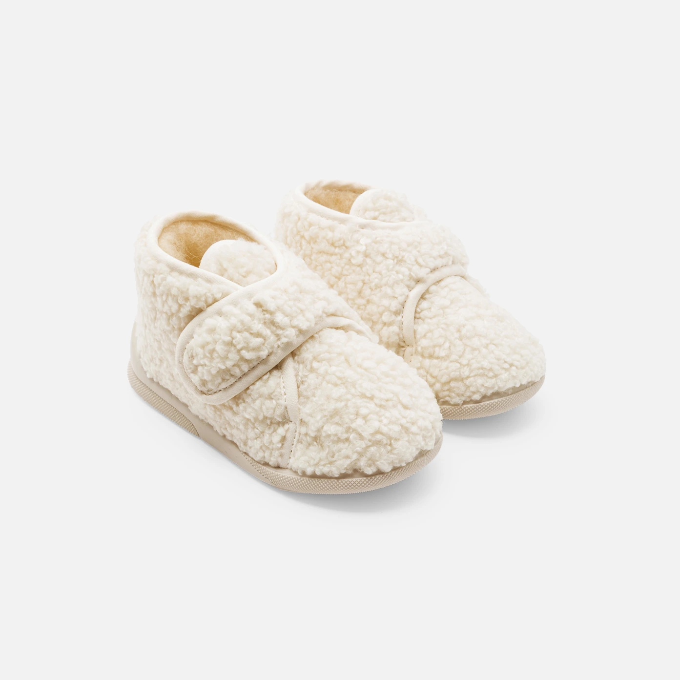 This season, baby booties opt for a cosy look. Made from shearling-effect faux fur and easy to slip on thanks to their wide opening and Velcro strap, they feature a non-slip sole. Wear them to get out of the bath or to enjoy Sunday mornings, they will offer everyday comfort with a touch of style.- Made in France- Sheepskin wool-effect faux-fur slippers- Textile lining- Non-slip sole- Wide opening- Velcro strap- This model fits normally.