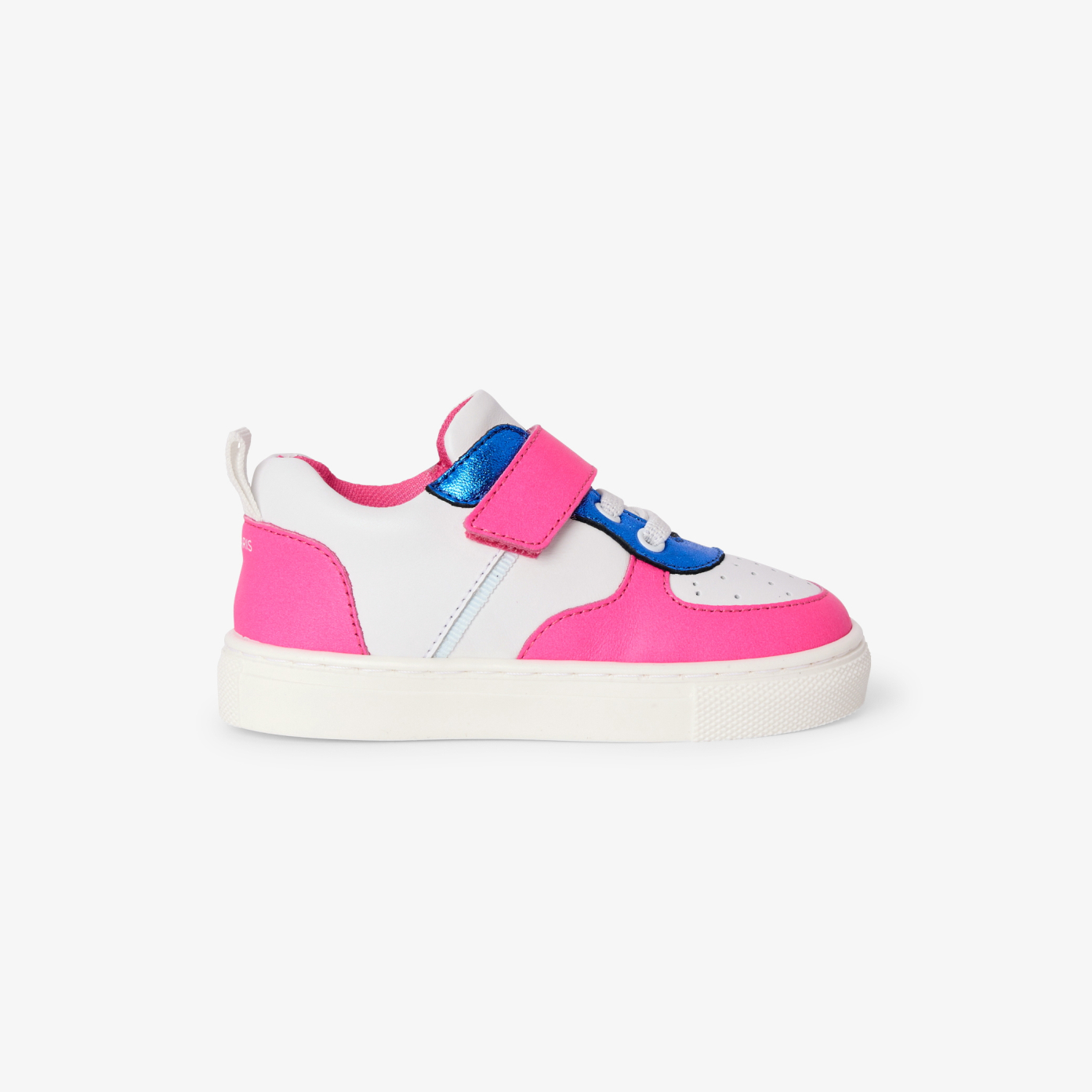 Give her her first trainers by opting for the modernity of this neon pop colour block model. In smooth leather, accessorised with neon pink and lamé inserts, these urban sneakers, to be worn with trousers or a dress for a contemporary silhouette, will be part of every look this season.- Made in Portugal- Smooth leather- Foamed collar, tongue and sole- Non-slip sole- Velcro opening and elasticated laces- This model fits normally.