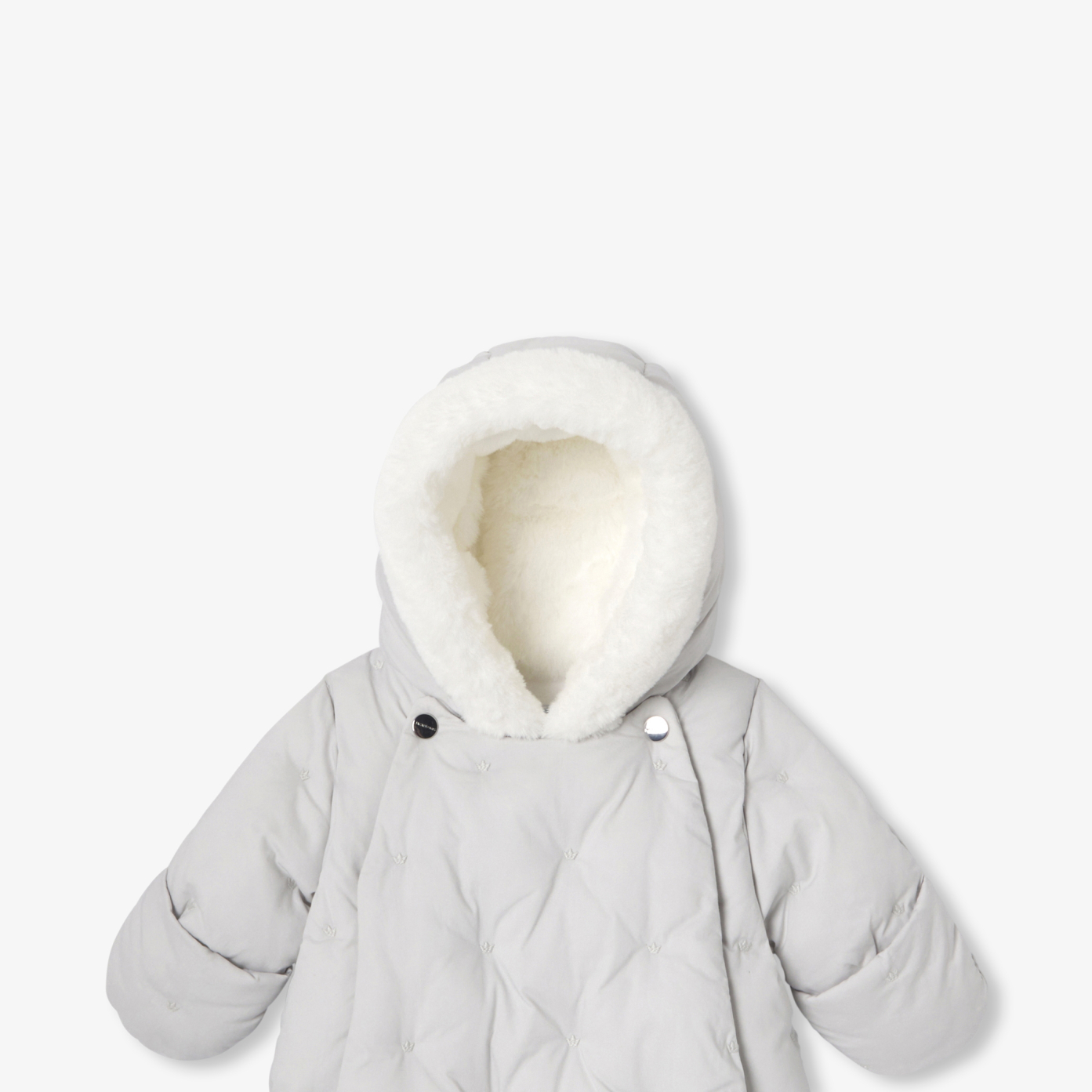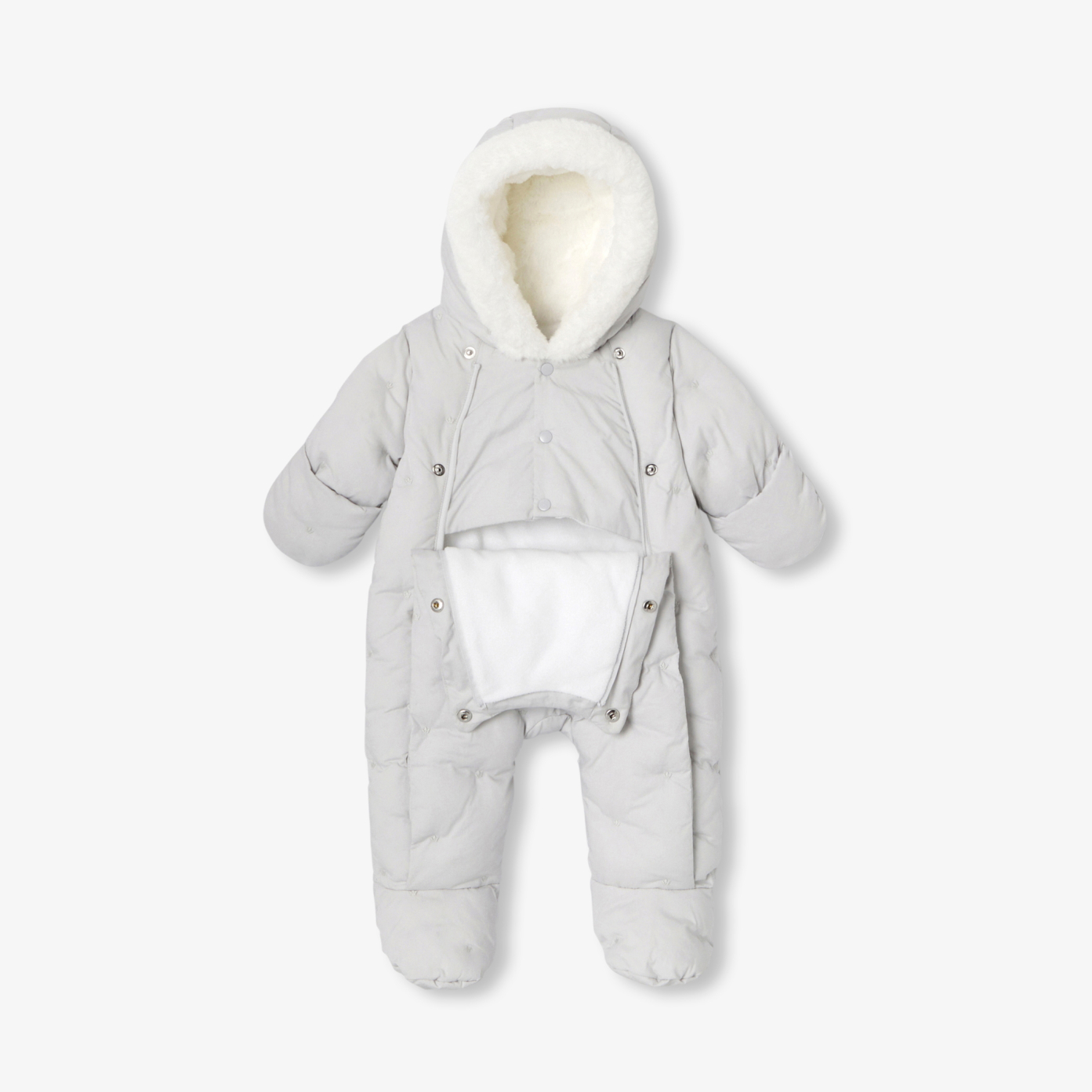 A warm winter in this water-repellent poplin pramsuit. Embroidered with little crowns, lined in microfleece and with faux fur in the hood, this must-have piece opens with a double zip to dress baby lying down or sitting up in complete safety. With integrated mittens, it is perfect for all outings in town or on the ski slopes.- Water-repellent technical poplin pilot suit - Microfleece lining - Faux-fur lined hood - Recycled fiber lining - Invisible double-zip opening- Integrated feet and mittens- Without feet from size 18 monthsWater-repellent treatment allows water to slide off the surface of the garment. It protects against light rain, but does not prevent water from passing through in the event of prolonged exposure or heavy rain.