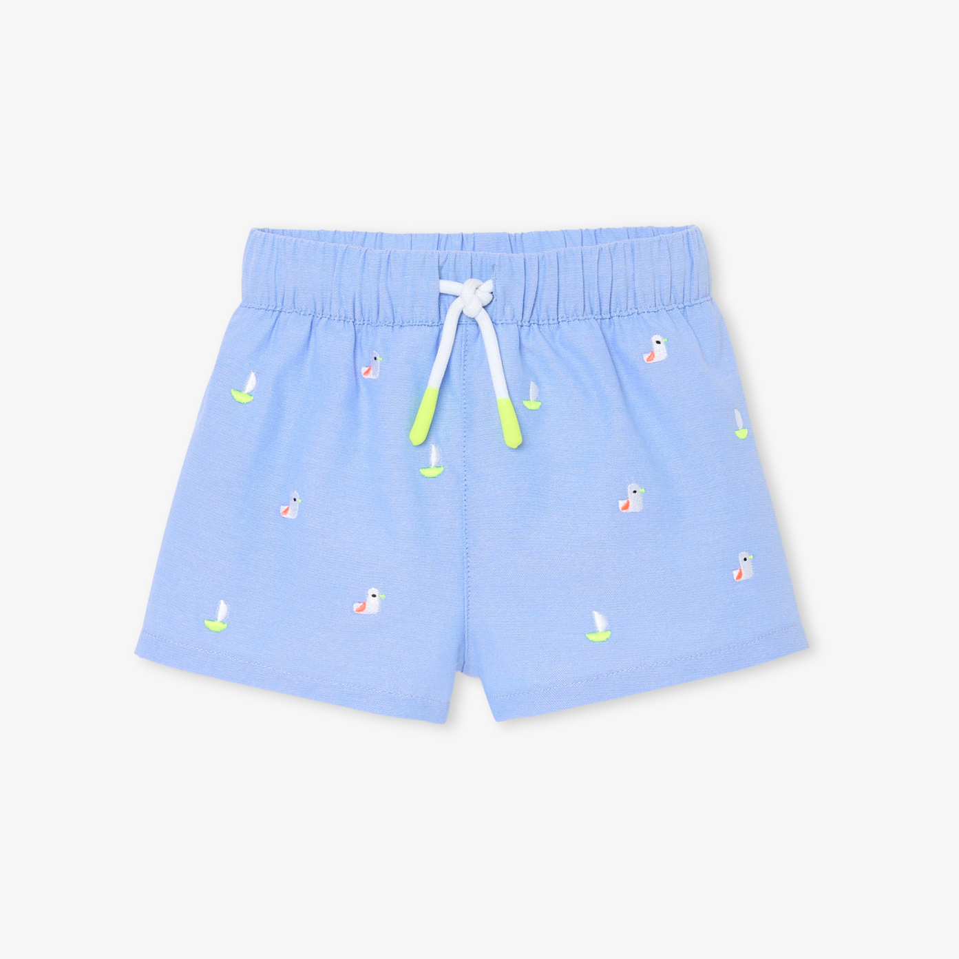 Slip these bright blue oxford baby boy swim shorts into your suitcase for the vacations, animated by the neon yellow and coral seagulls and boats. Wear them to the beach or pool with a UV-protective t-shirt and cap. - Baby swim shorts with elasticated waist - Drawstring - Integral briefs in comfortable, quick-drying mesh
