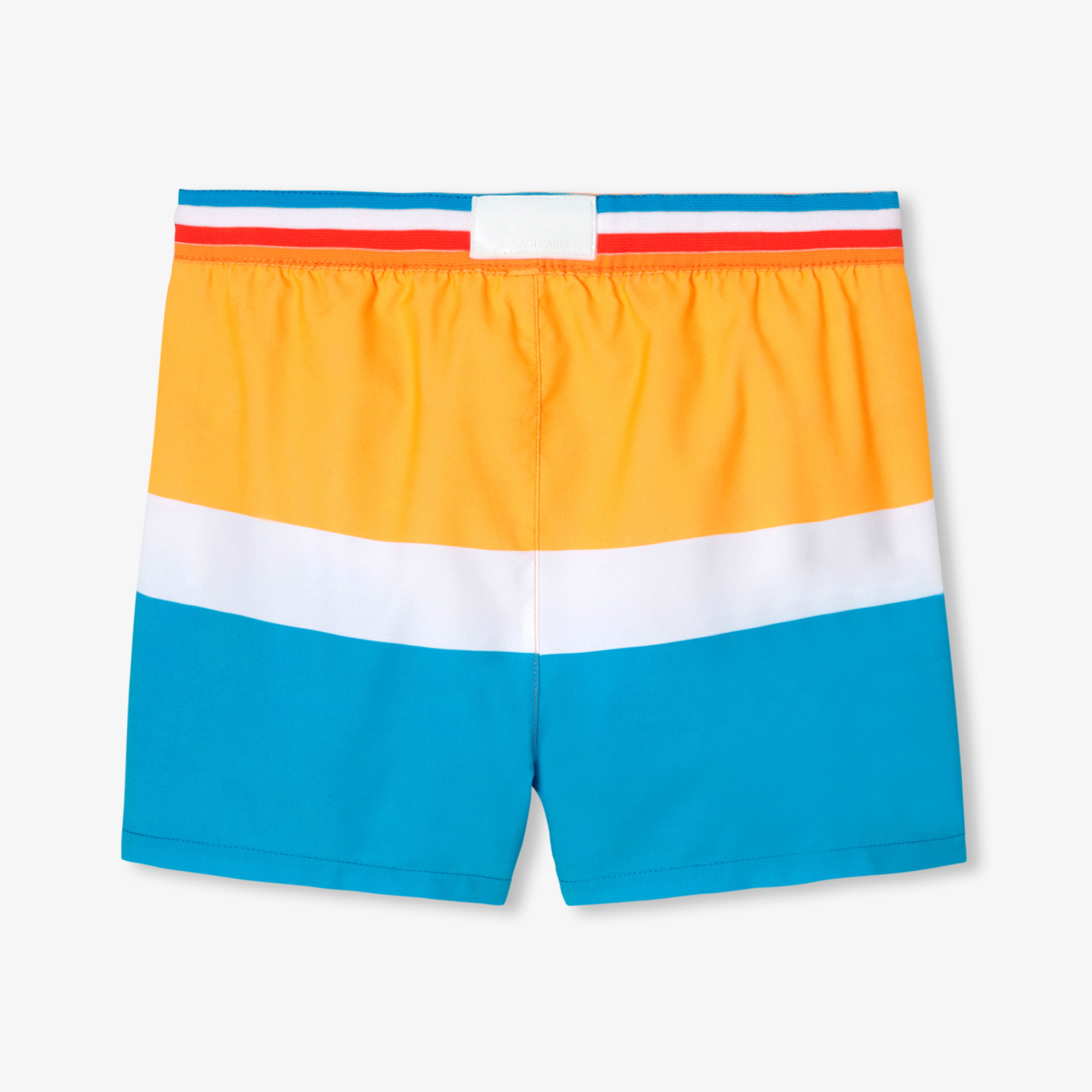 These boy swim shorts go surfing for summer. With contrasting stripes for a colourblock look, surfboards and a shark finish off this model to be worn with a UPF 40+ UV protection t-shirt and a cap all summer long.- Swim shorts in recycled polyester- Contrasting stripes- Elasticated striped waist- Drawstring- Integrated briefs