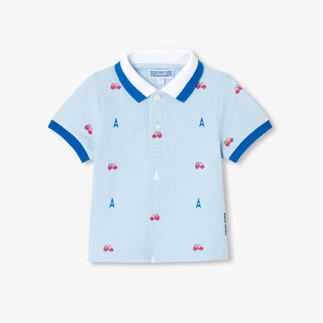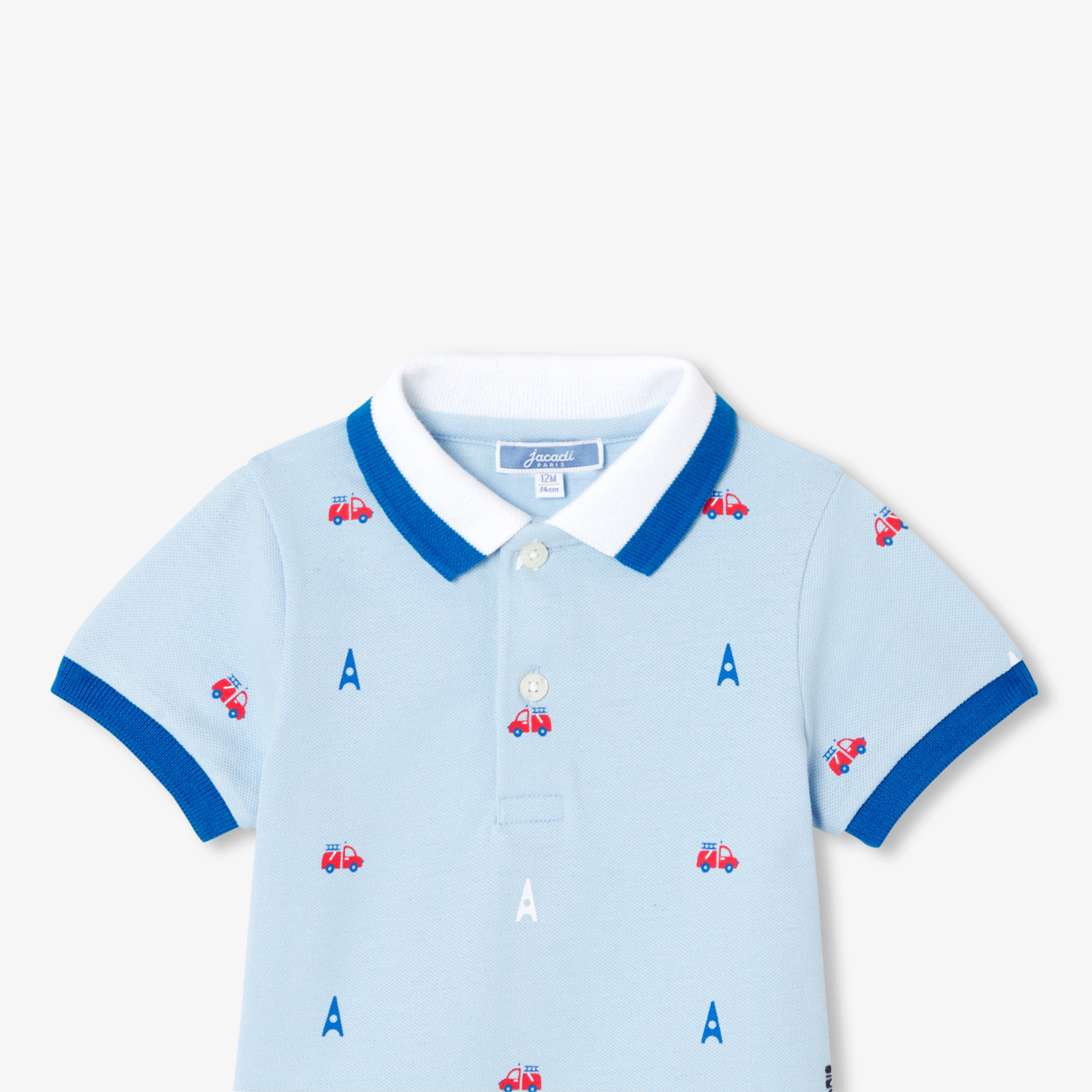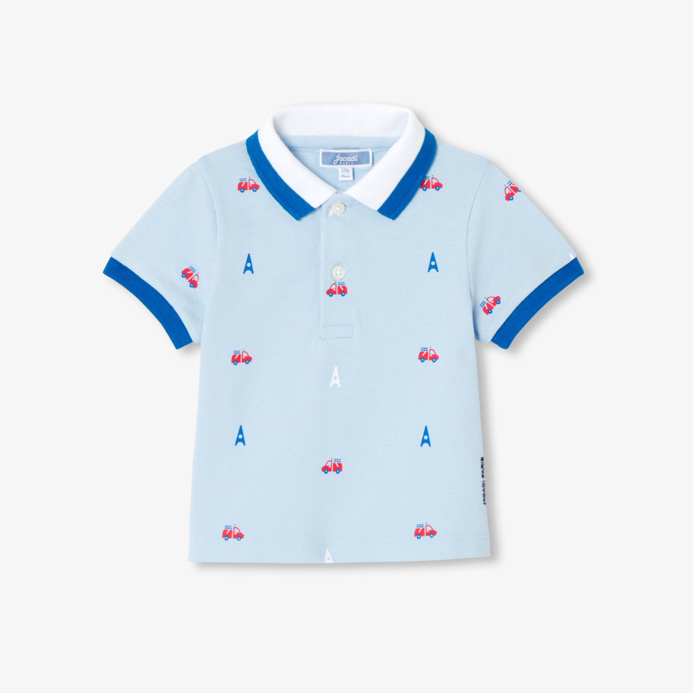 Eiffel Towers and little cars printed on organic cotton piqué, striped collar details and contrasting ribbed cuffs, this baby boy polo rivals Parisian chic for originality. Mixed with twill trousers or shorts, it will accompany baby's daily routine from spring to late summer.-Baby polo shirt in organic cotton piqué-Polo collar and ribbed hem-Parisian motifs-Button placket at neckline