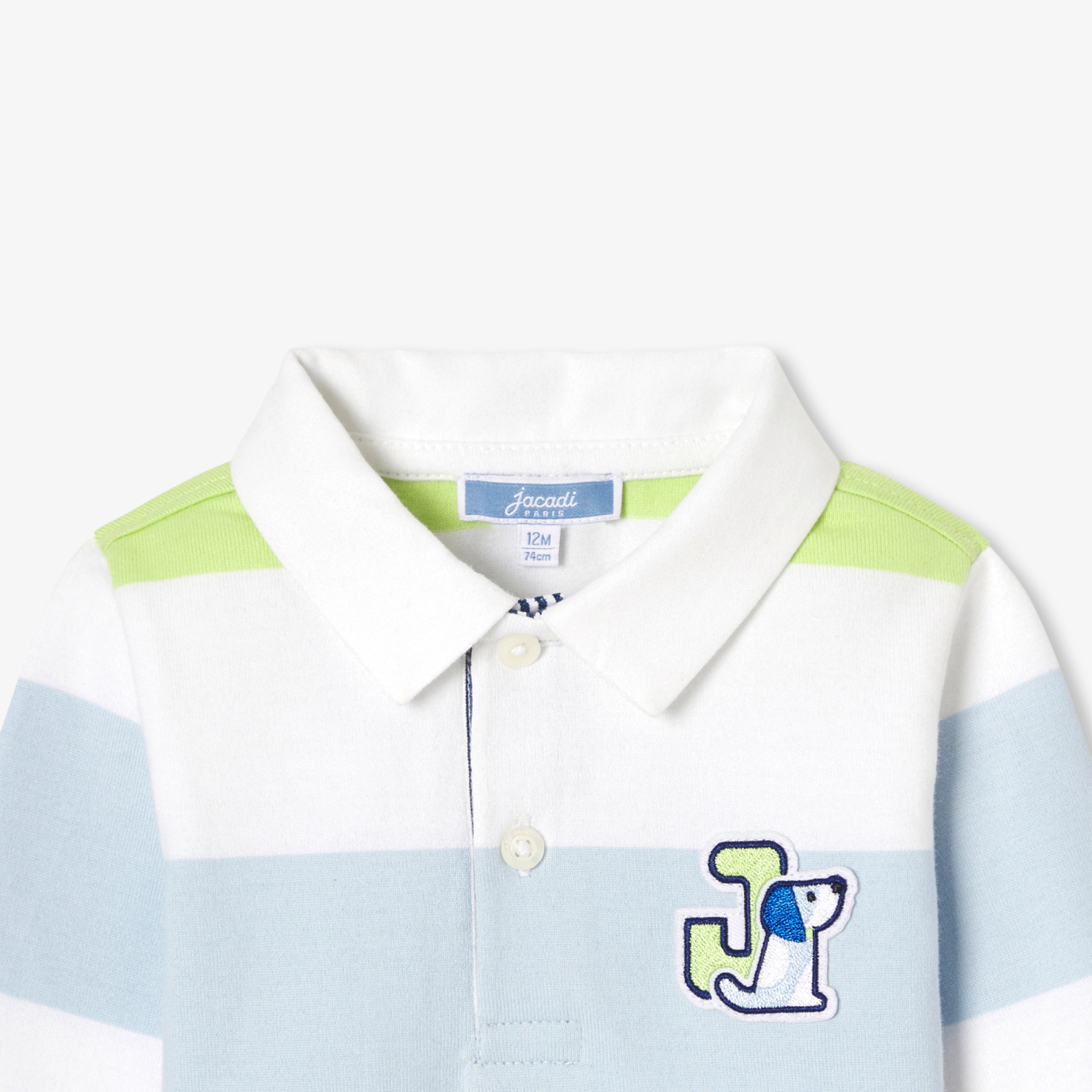 A classic of the preppy wardrobe, this baby boy long-sleeved polo shirt promises a sporty-chic, geometric look with its wide stripes and chest badge. Worn with patterned shorts for spring, a pair of beige twill trousers will be his best ally for back-to-school.-Long-sleeved baby polo shirt in organic cotton jersey-Twill collar-Inner striped placket-Badge on chest