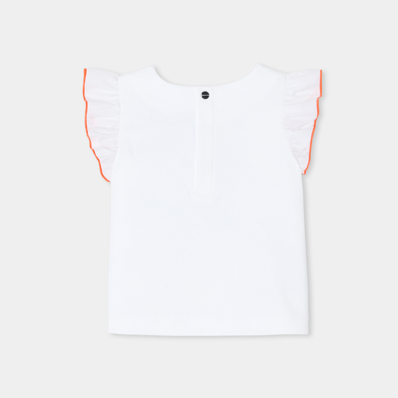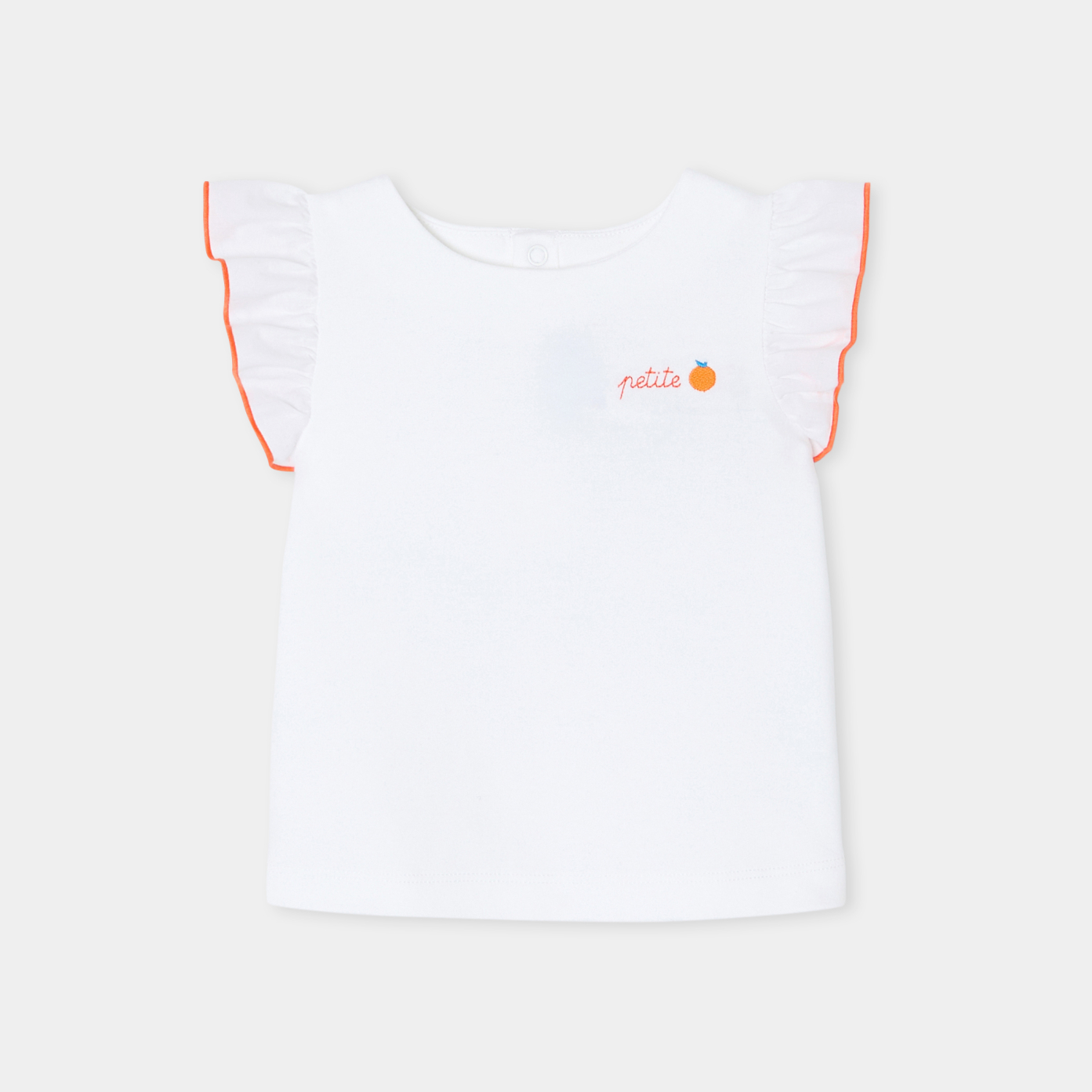 A cosy, pop season dressed up in this baby girl t-shirt. In soft, supple cotton, ruffled poplin sleeves with Bourdon stitch and embroidery on the chest make this model perfect for wearing with orange twill shorts and pretty sandals for the vacations.-Cotton baby girl t-shirt-Ruffled poplin short sleeves embroidered with an orange Bourdon stitch-Breast embroidery-Snap closure at back