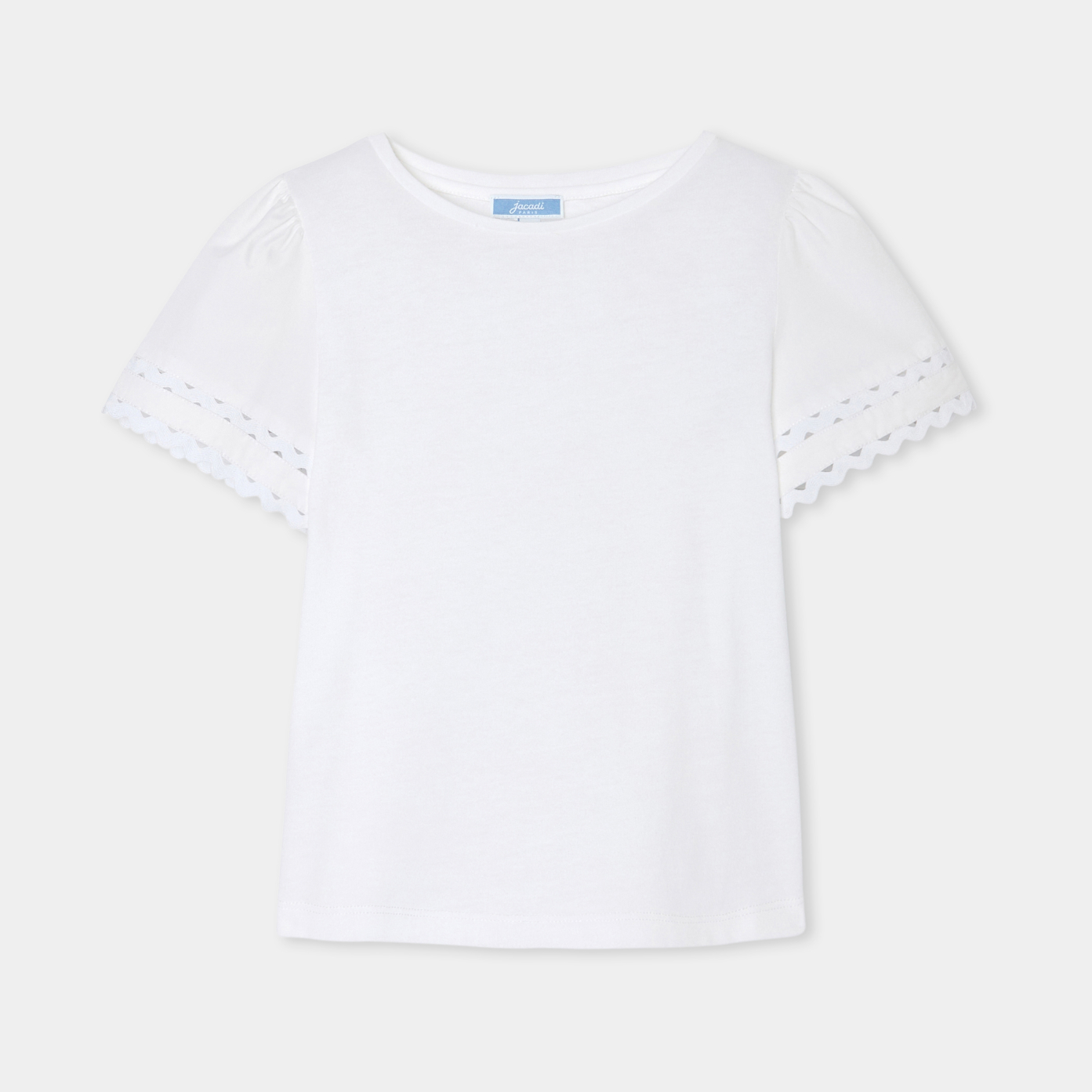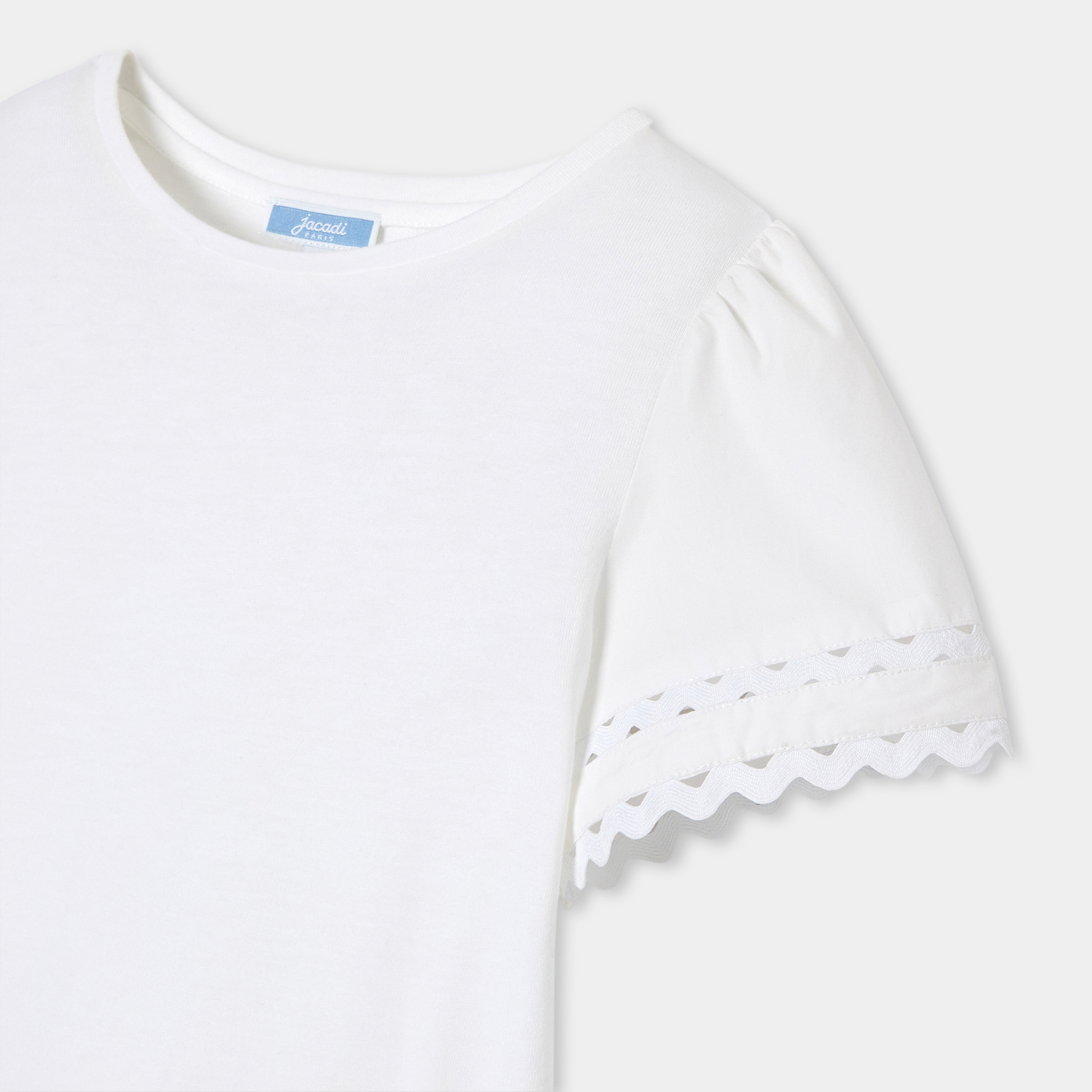 Soft, supple organic cotton, with croquet ribbon sleeves that add style to the silhouette. Worn with wide-leg jeans or shorts, this folk-look girl t-shirt will easily fit into a little girl's everyday life.- Girl t-shirt in organic cotton- Croquet ribbon sleeves- Back opening for sizes 3 and 4.