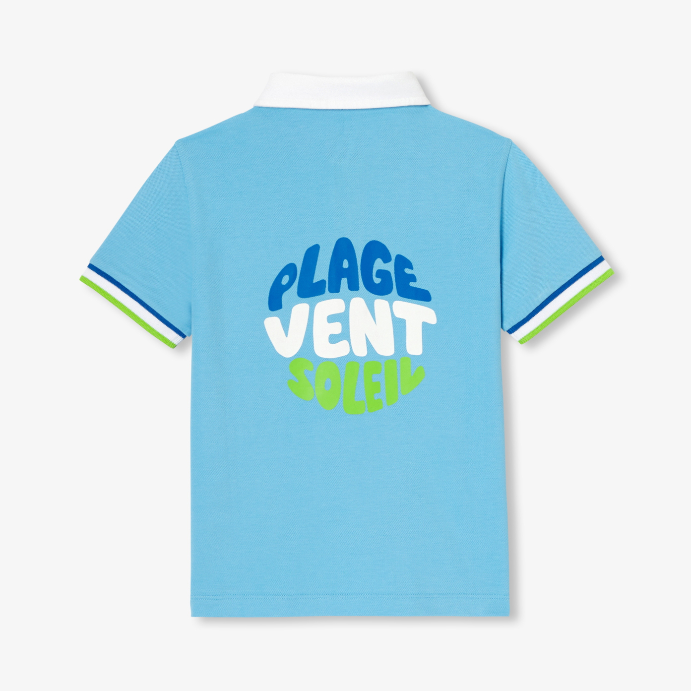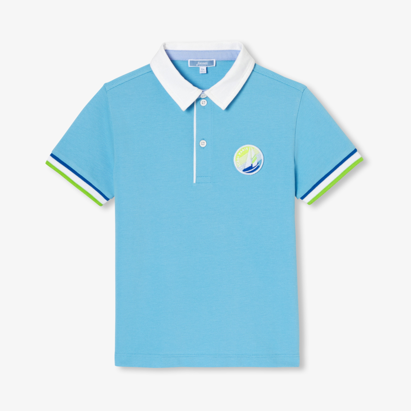 This boy polo shirt is the perfect choice for vacations on the beach, in the wind and in the sun. A timeless summer wardrobe staple in cotton piqué, the sky-blue colour, twill collar, striped cuffs and boat badge on the chest modernise this model, which can be worn with checked Bermuda shorts for a trip into town or a sailboat escapade.- Boy polo shirt in organic cotton piqué- Short sleeves- Twill collar and striped cuffs- Badge on chest- Button placket opening.