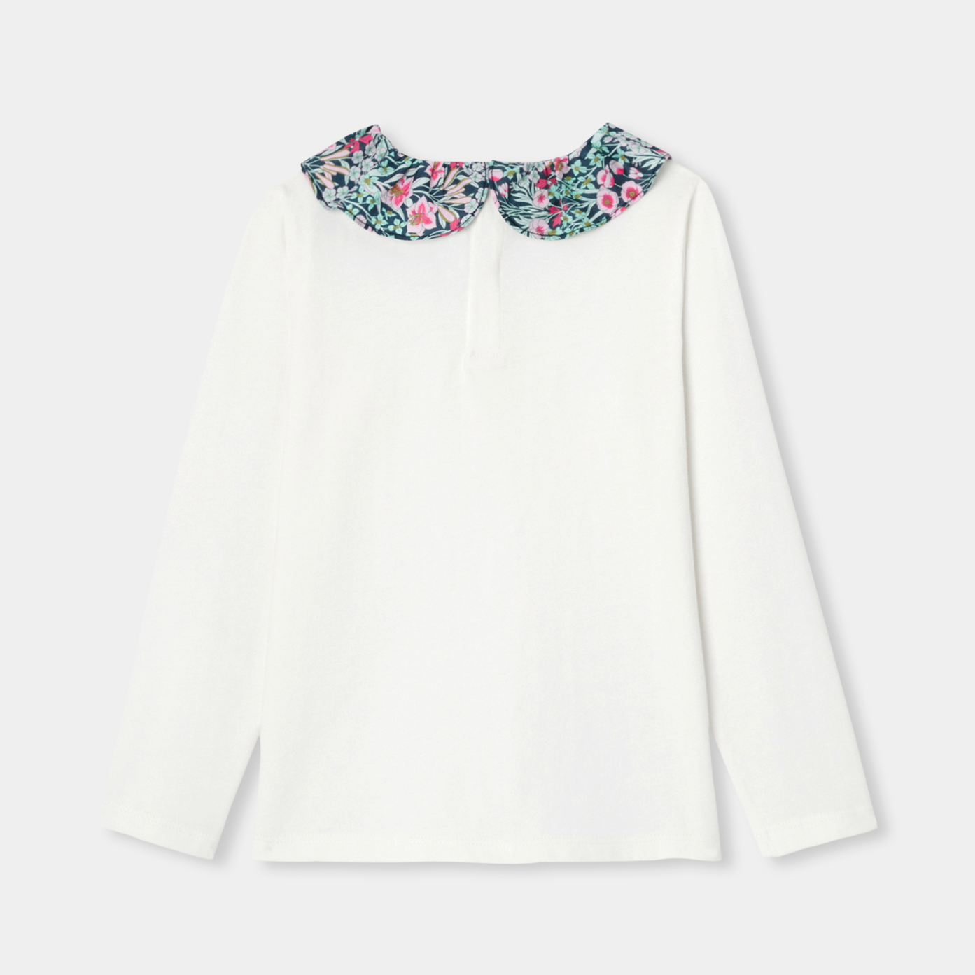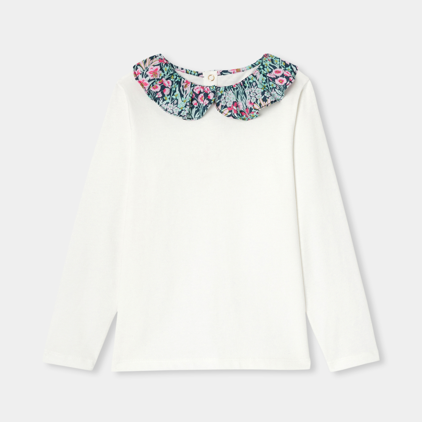 A classic for everyday wardrobes, this girl long-sleeved t-shirt opts for a Liberty fabric collar to stand out from the crowd. Made from soft, supple organic cotton, shorts and trousers are the perfect match for this romantically charming model.- Organic cotton T-shirt- Long sleeves- Press stud opening at back- Liberty Mountain Primerose fabric collar - Jacadi exclusive colouring